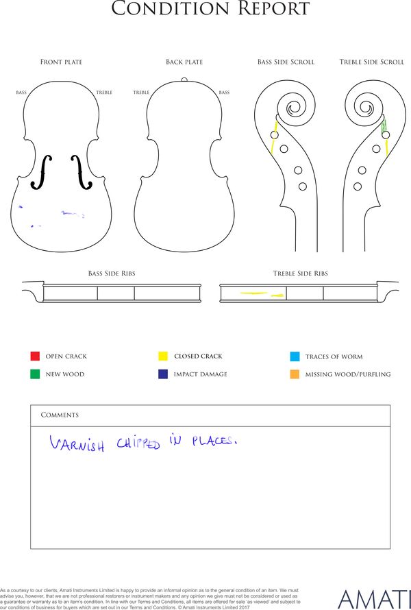 Label: Fait sous la Direction de | Marc Laberte | Maitre Luthier | Mirecourt France No. 2575 | Further Labelled: Copie de Antonius Stradivarius [...]