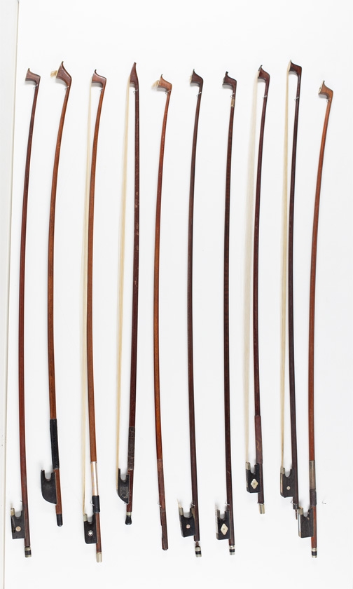 Eight violin bows and two child's violin bows, various sizes