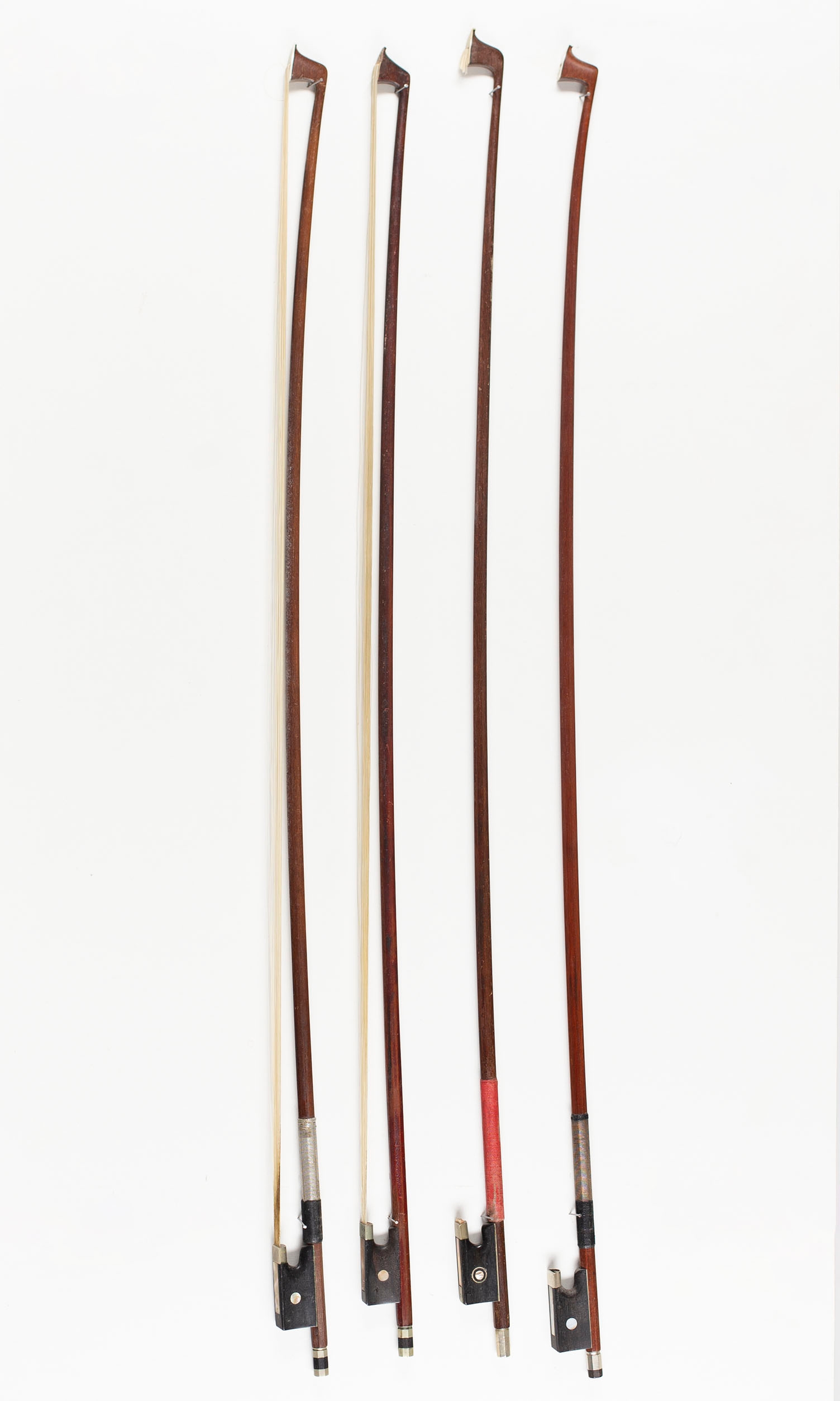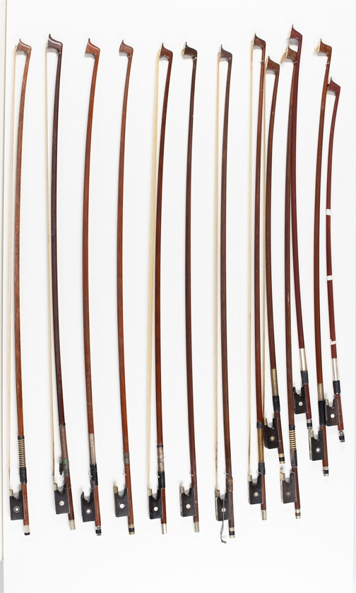 Thirteen violin bows and four child's violin bows, various sizes