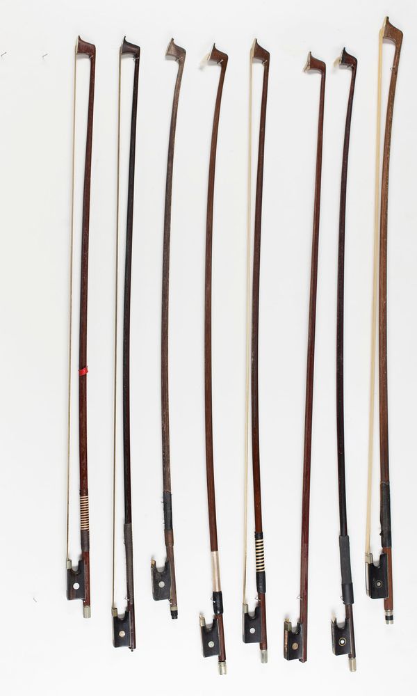 Eleven violin bows, four child's violin bows, one violin bow stick, one cello bow and one bass bow, various sizes