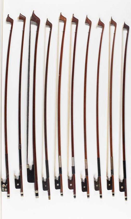 Nine cello bows and one bass bow