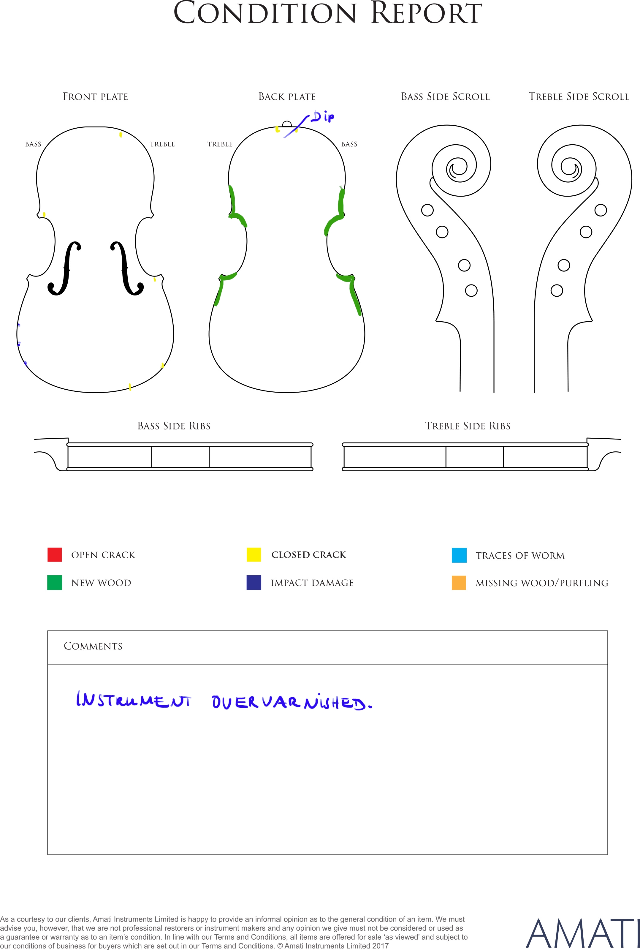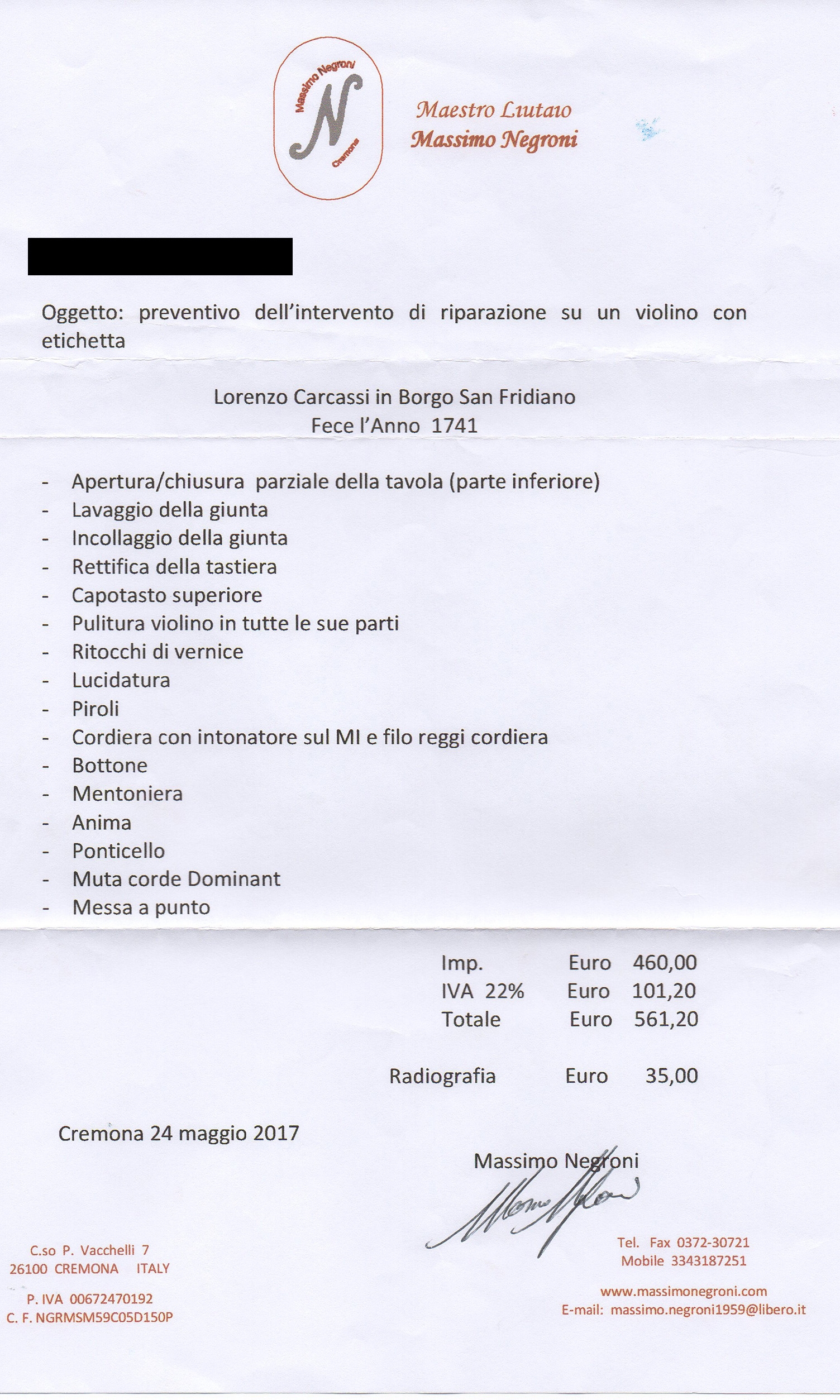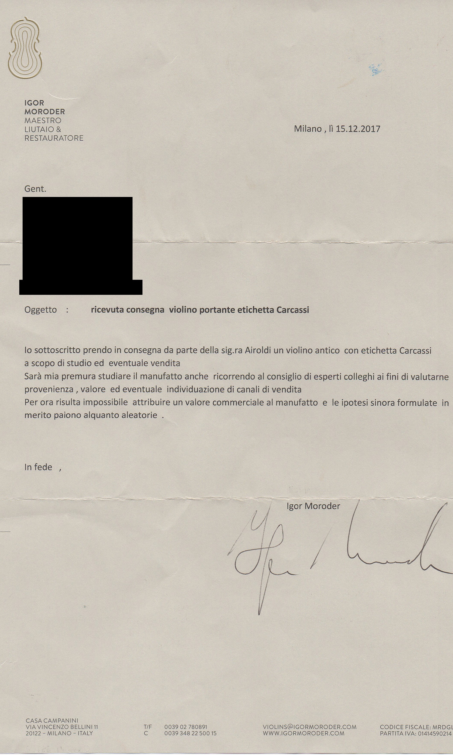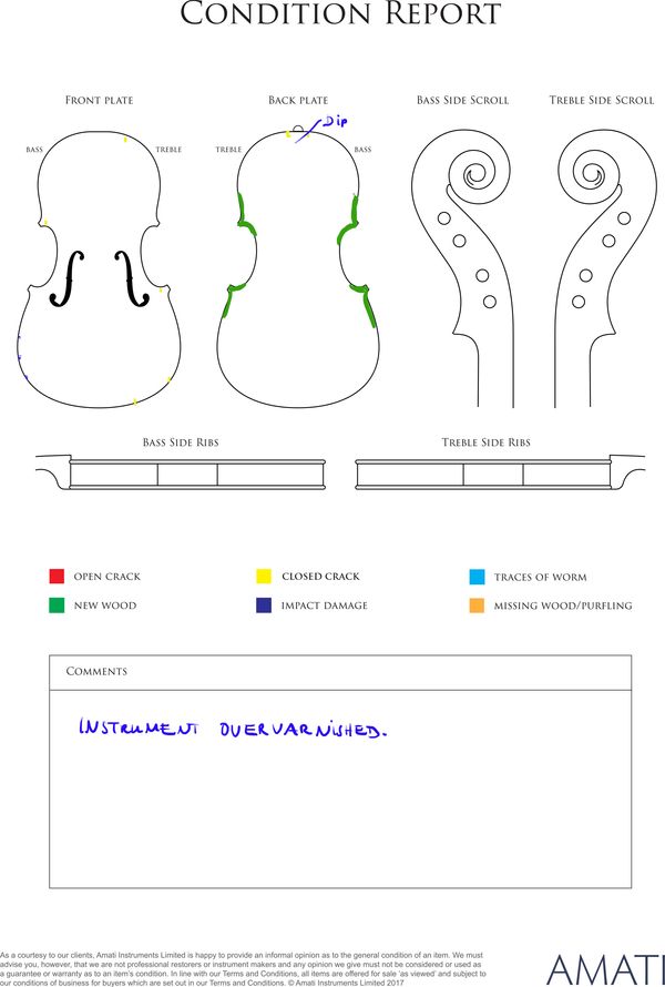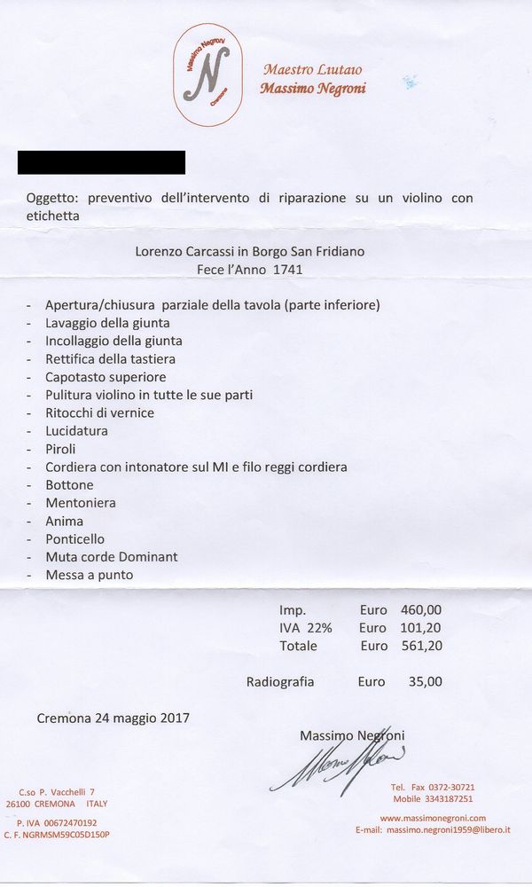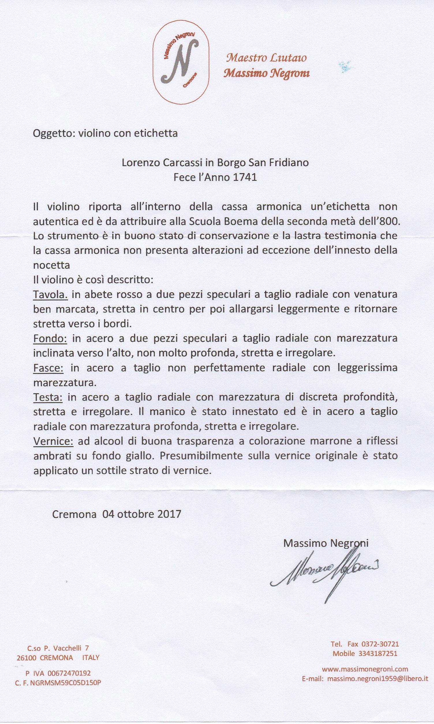 Sold with: 1 Three letters from Massimo Negroni, Cremona, 2017 and the letter of Igor Moroder, Milan, 2017 and an x-ray