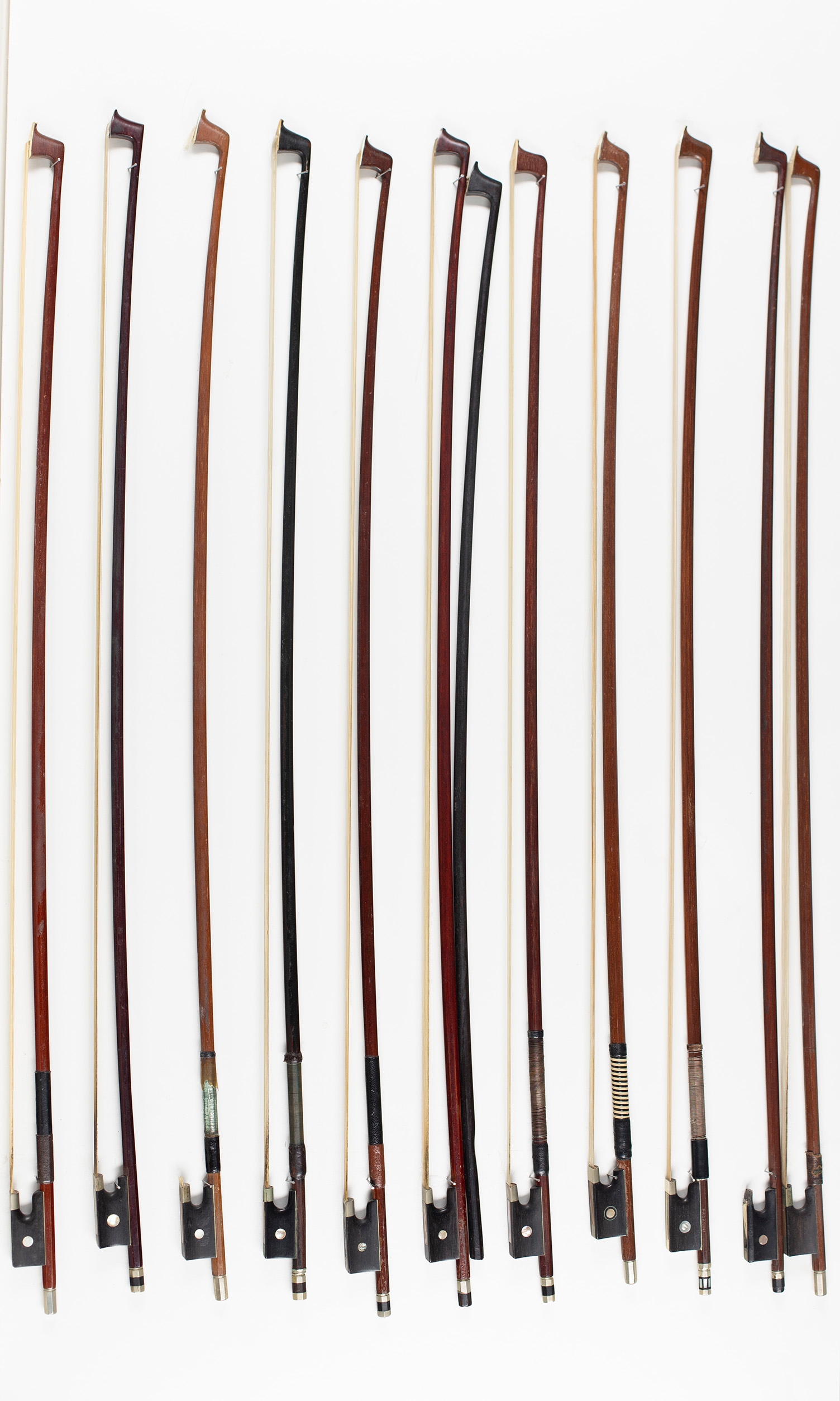 Eleven violin bows and one bow stick