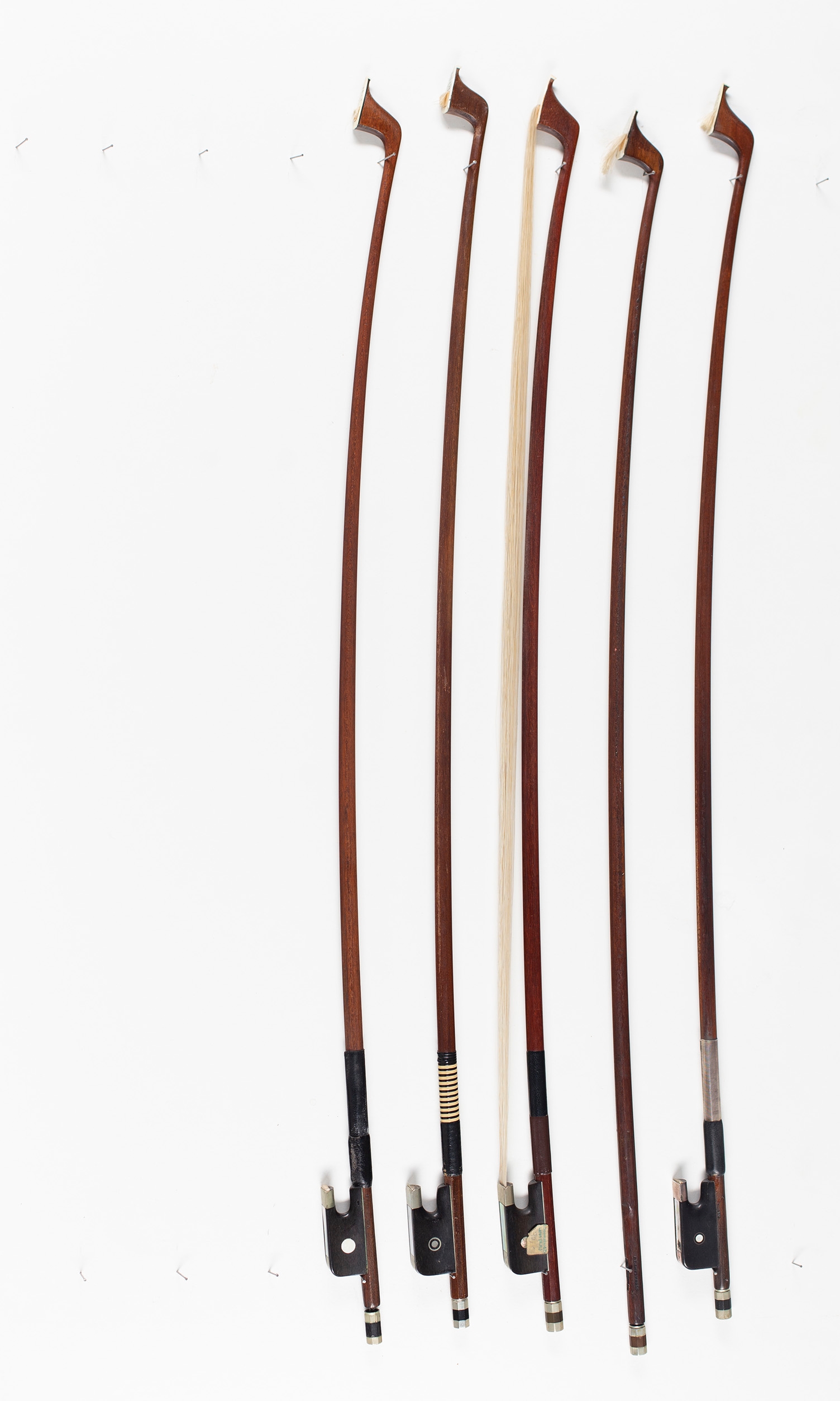 Four cello bows and one cello bow stick