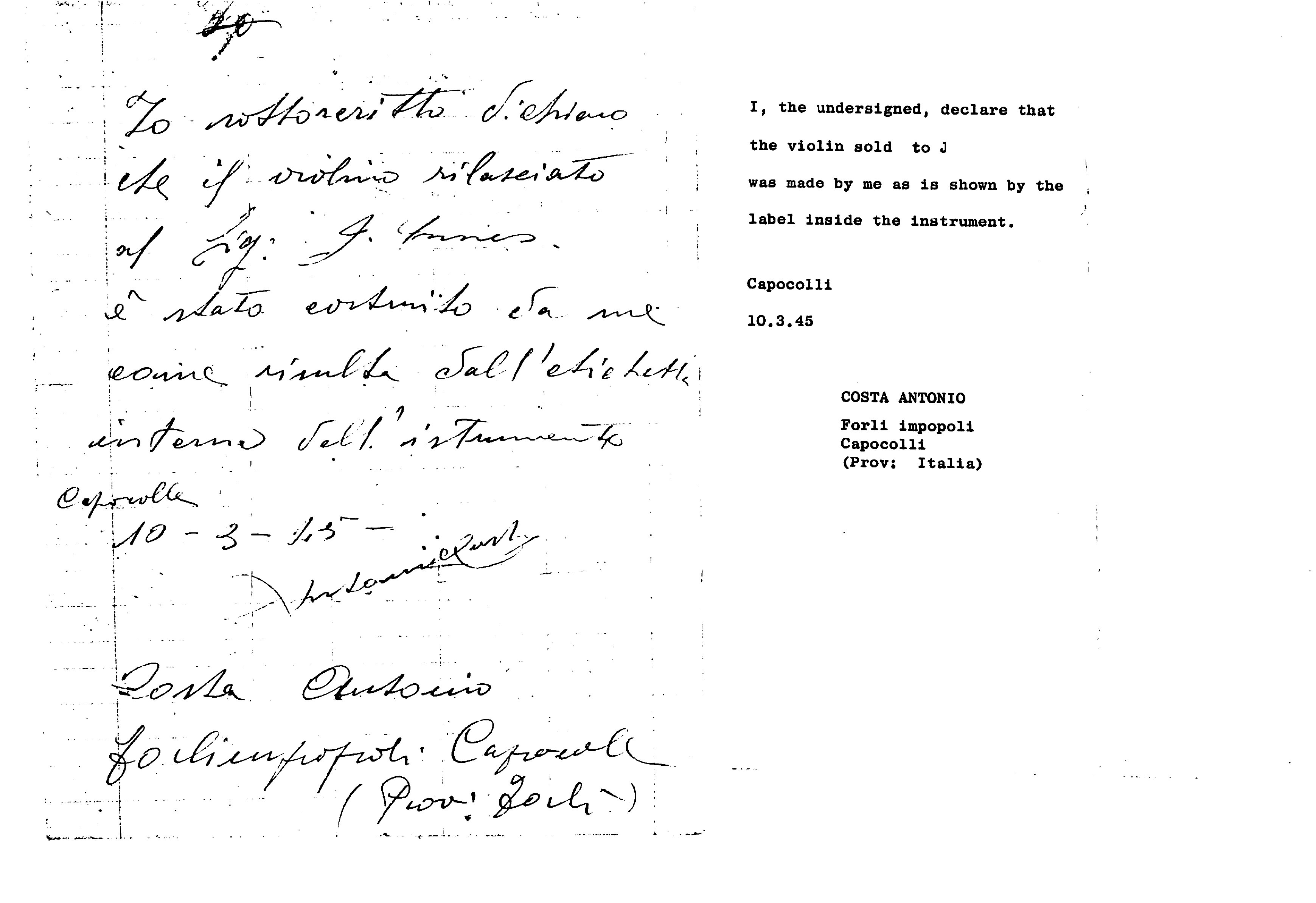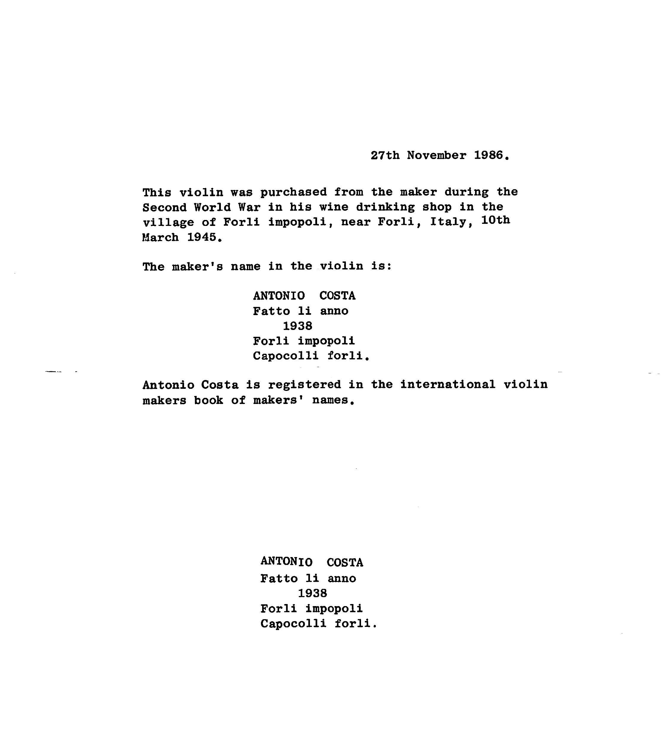 A violin by Antonio Costa, Forlimpopoli, 1945