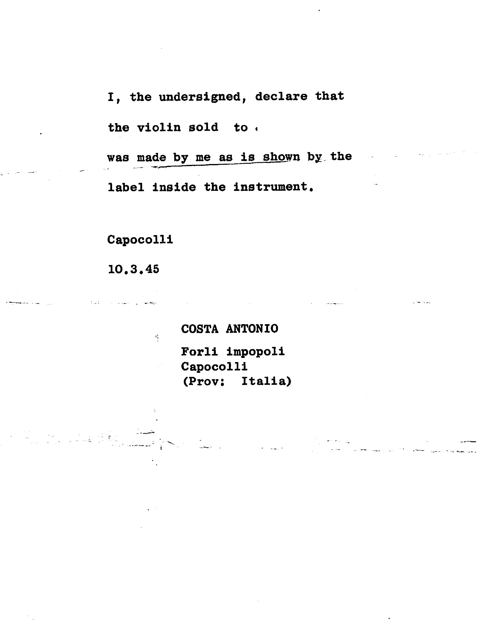 0 - a provenance letter from the maker, 1945