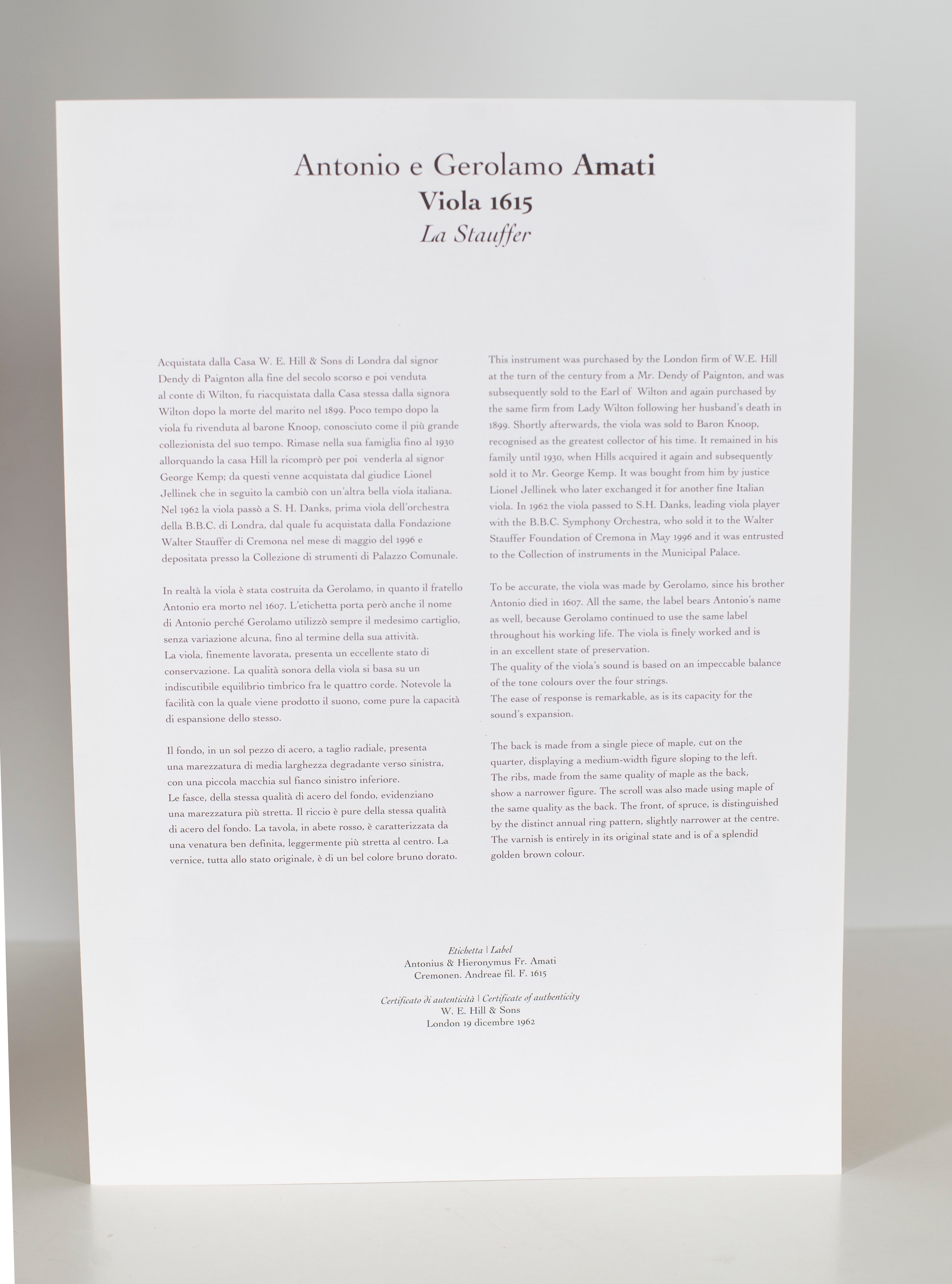 A monograph of the Antonio & Gerolamo Amati viola, 'La Stauffer', 1615