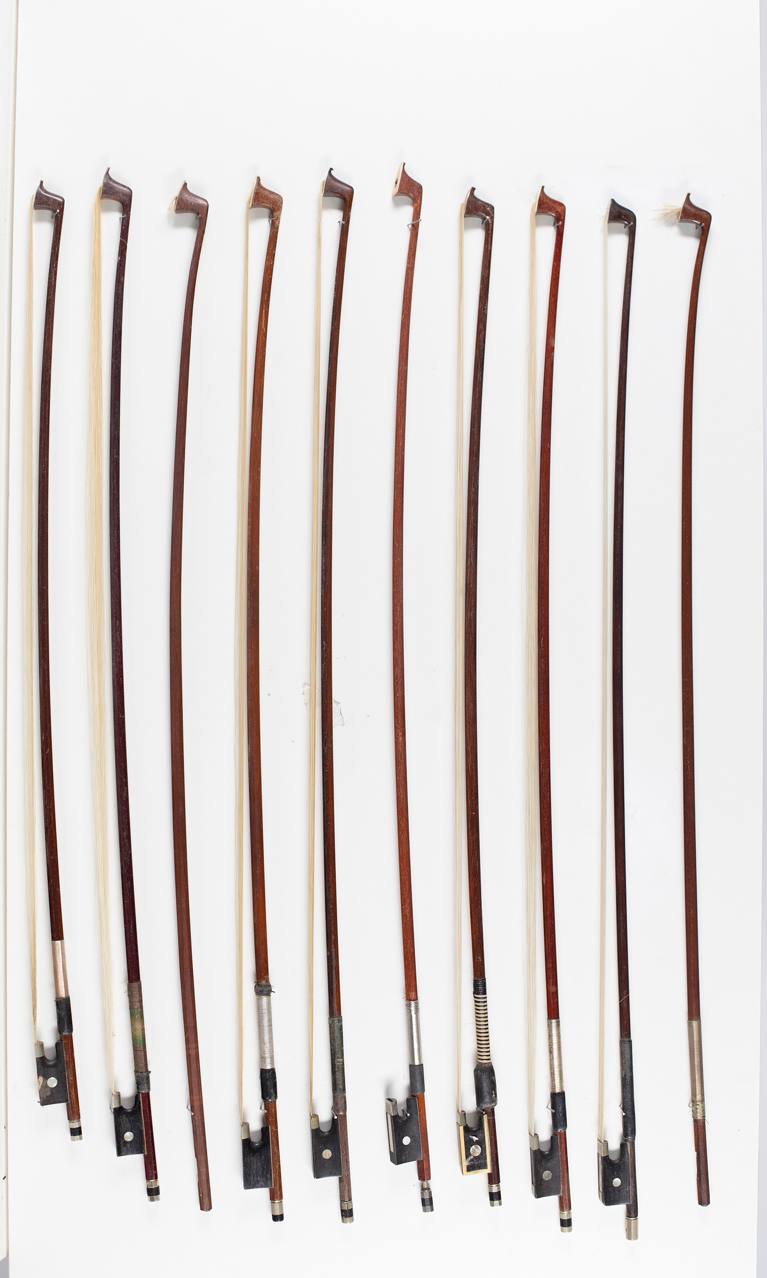 Eight violin bows and two bow sticks, varying lengths