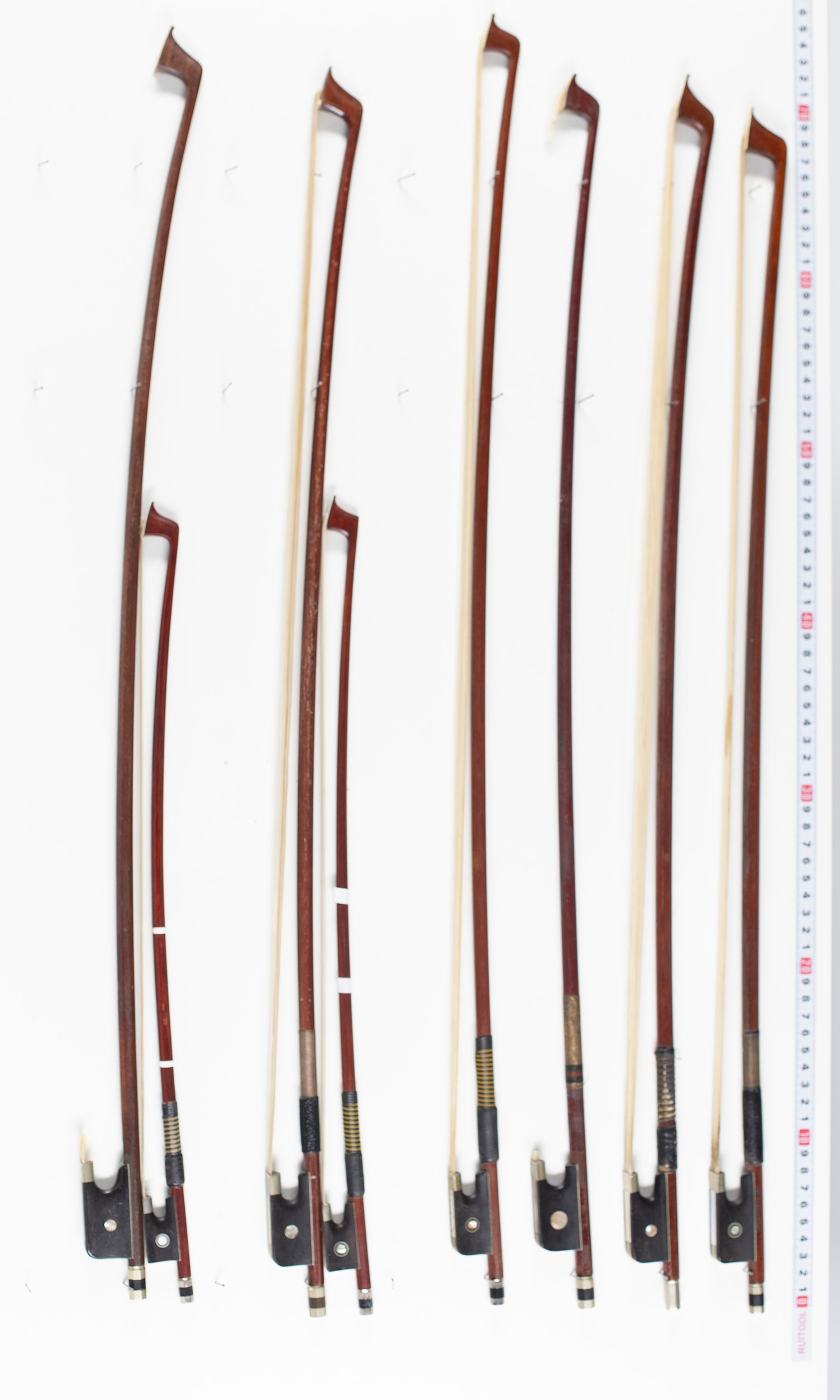 Two child violin bows and six cello bows, varying lengths