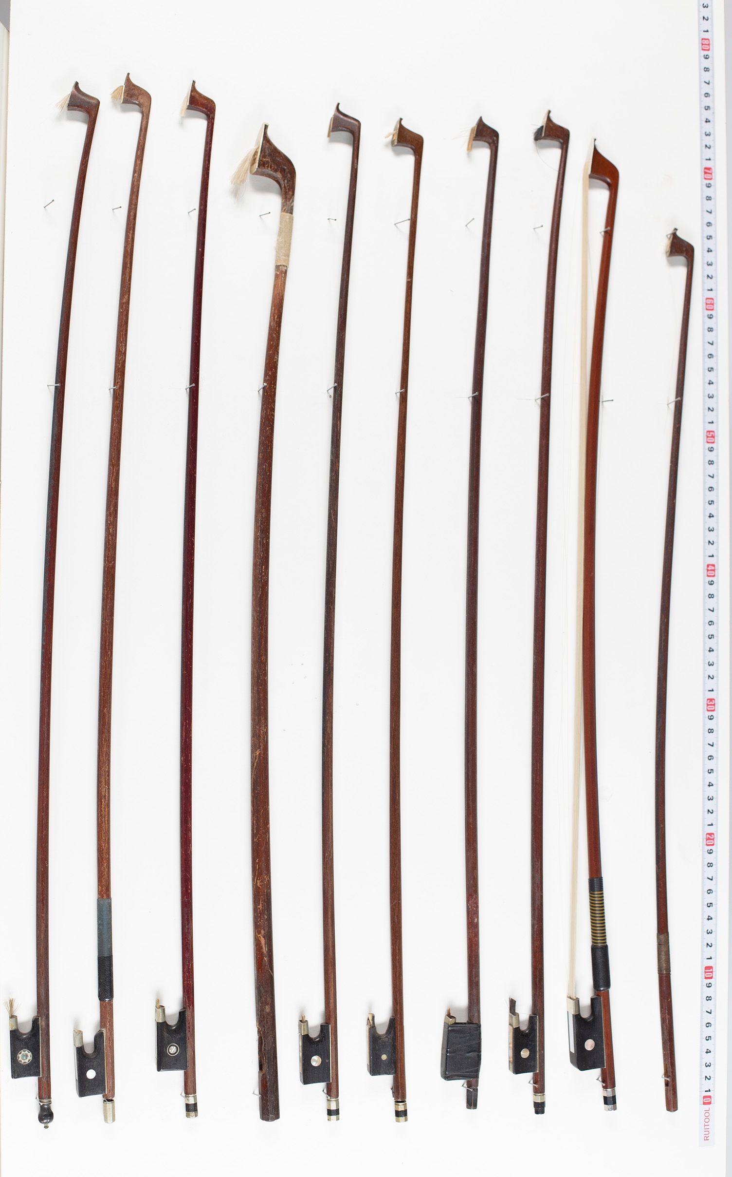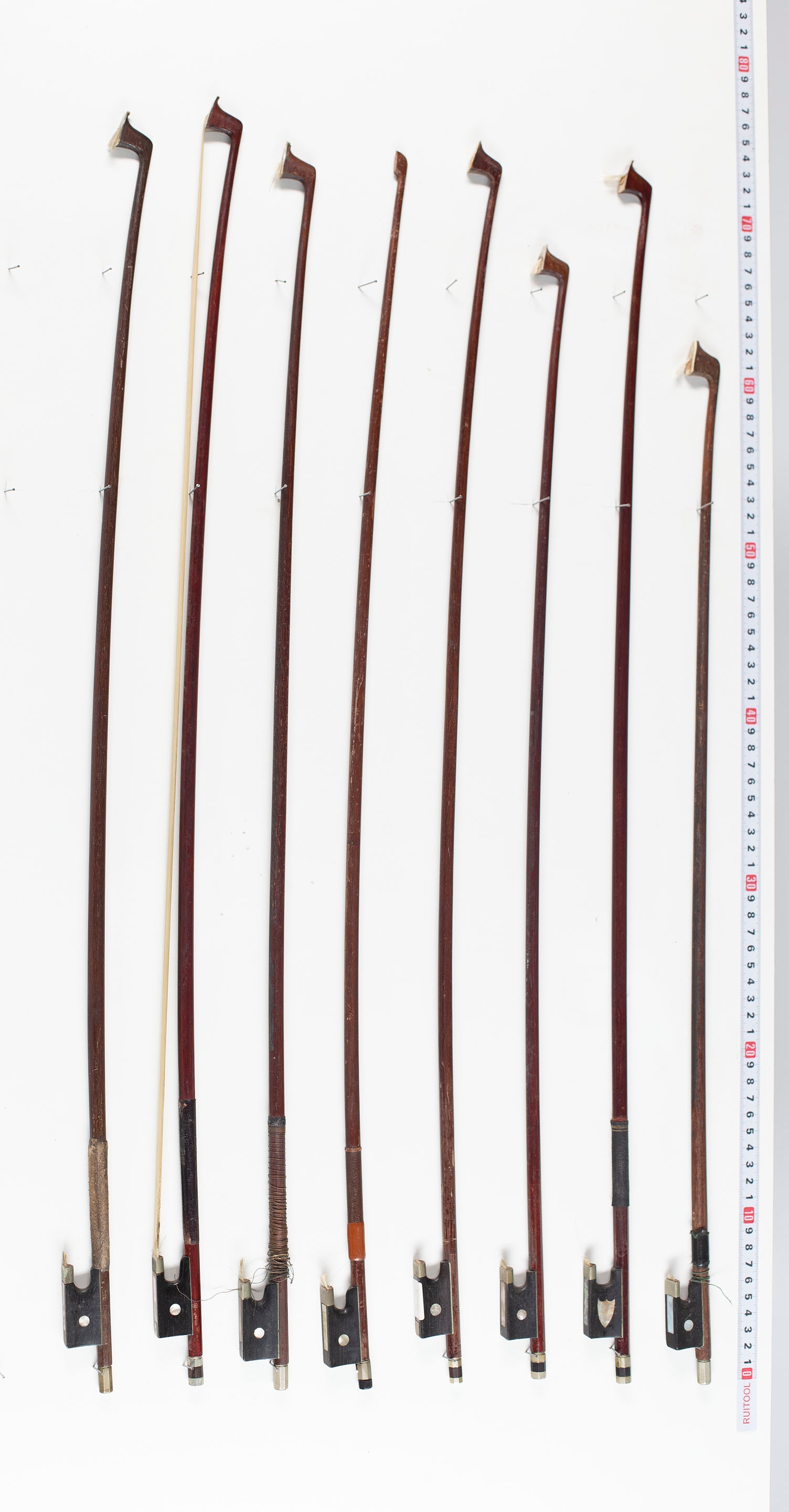 Fifteen violin bows, one cello bow, one bass bow and one bow stick, varying lengths