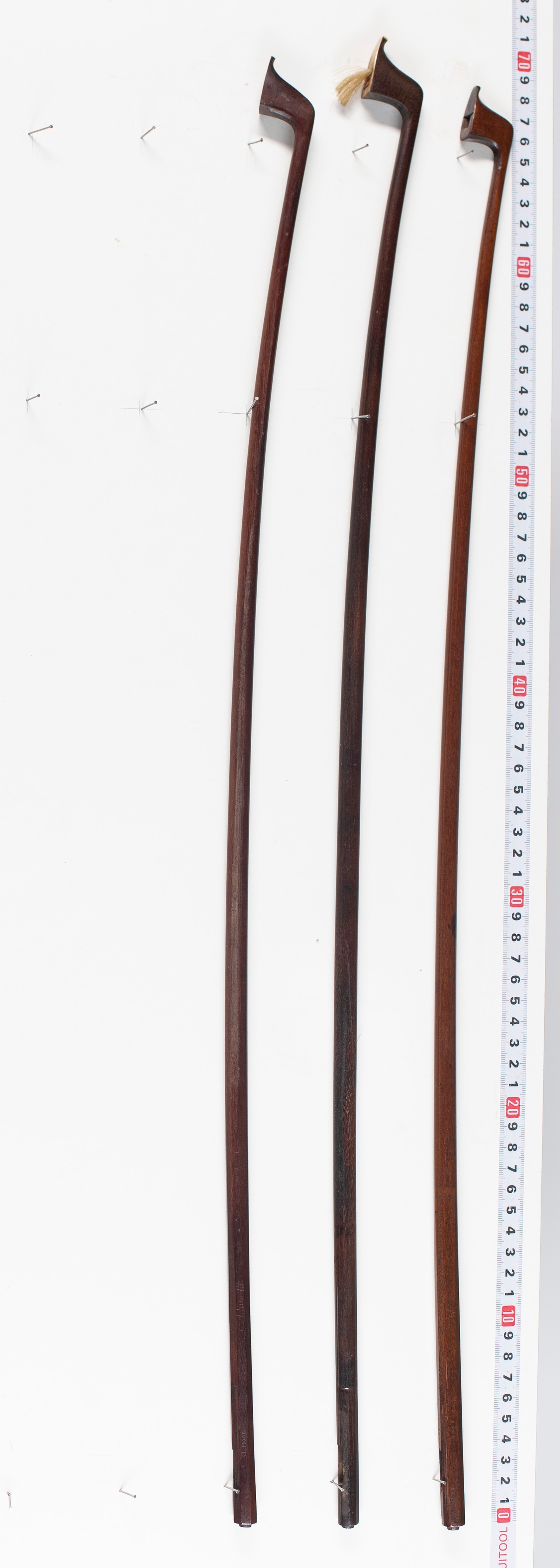 Three bow sticks branded Dodd, varying lengths