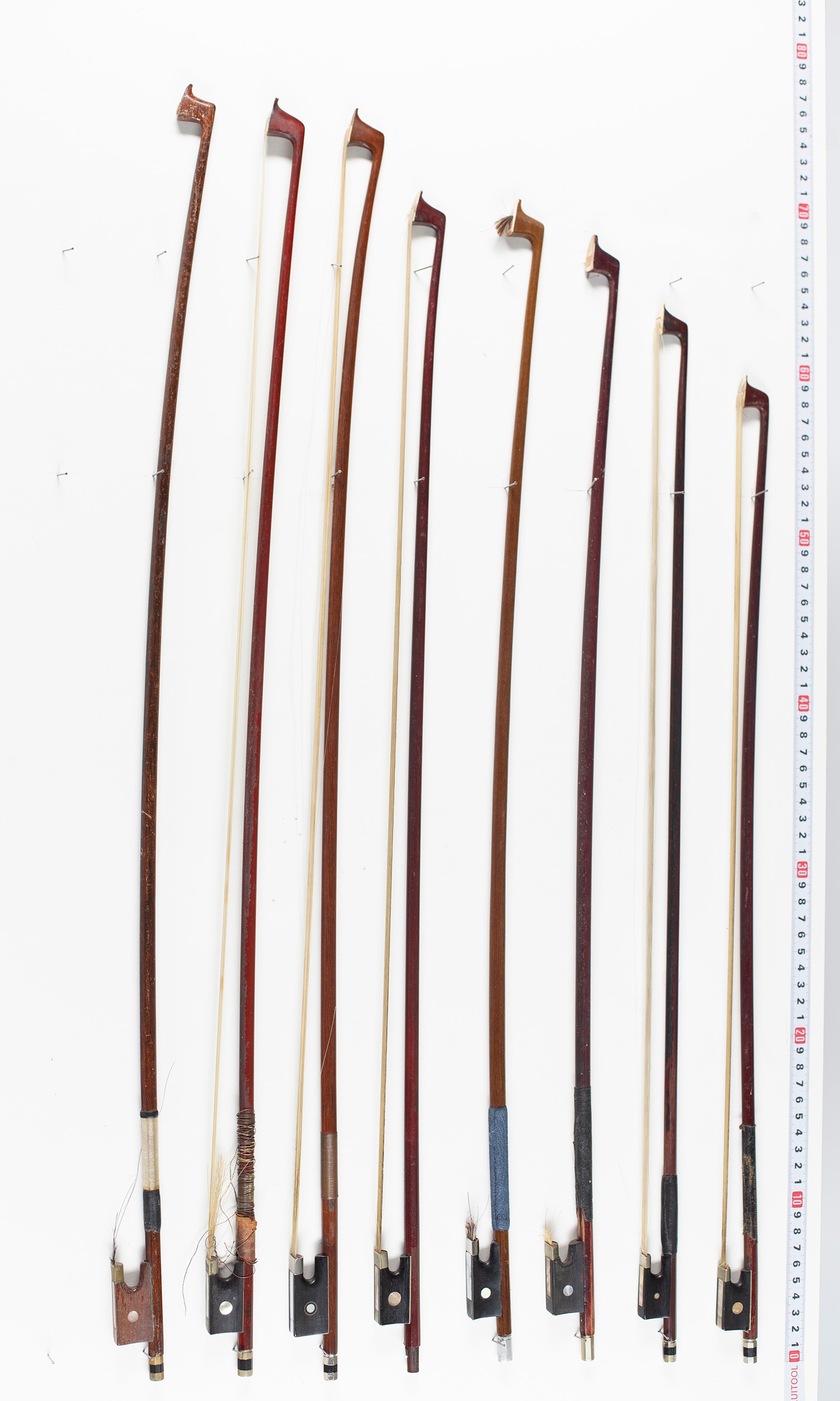 Eight violin bows, varying lengths