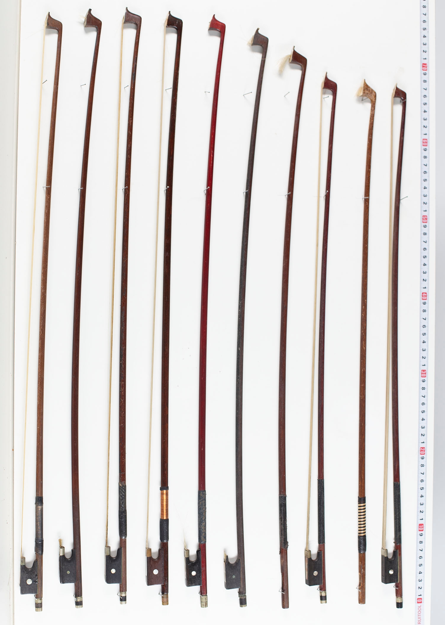 Eighteen violin bows and two bow sticks, varying lengths