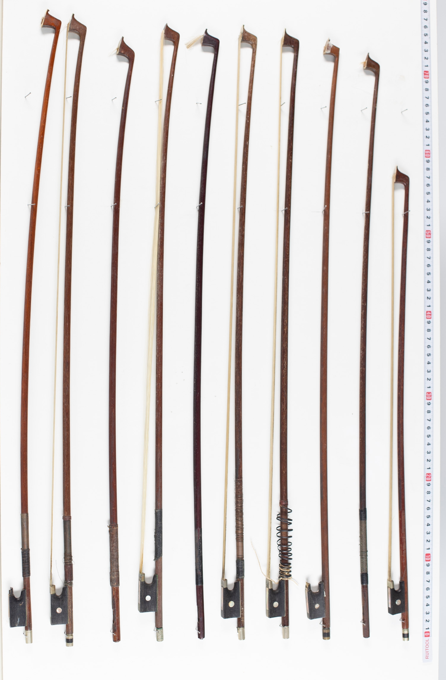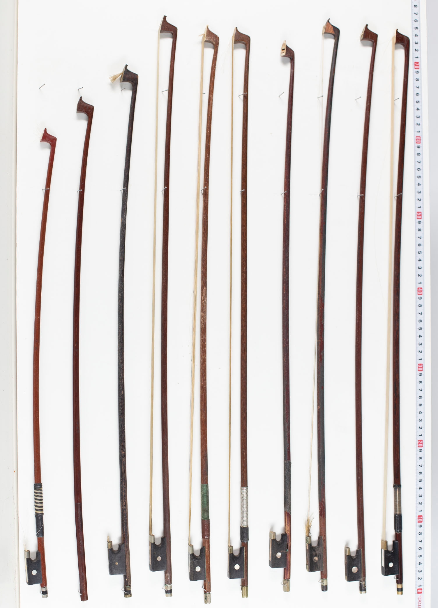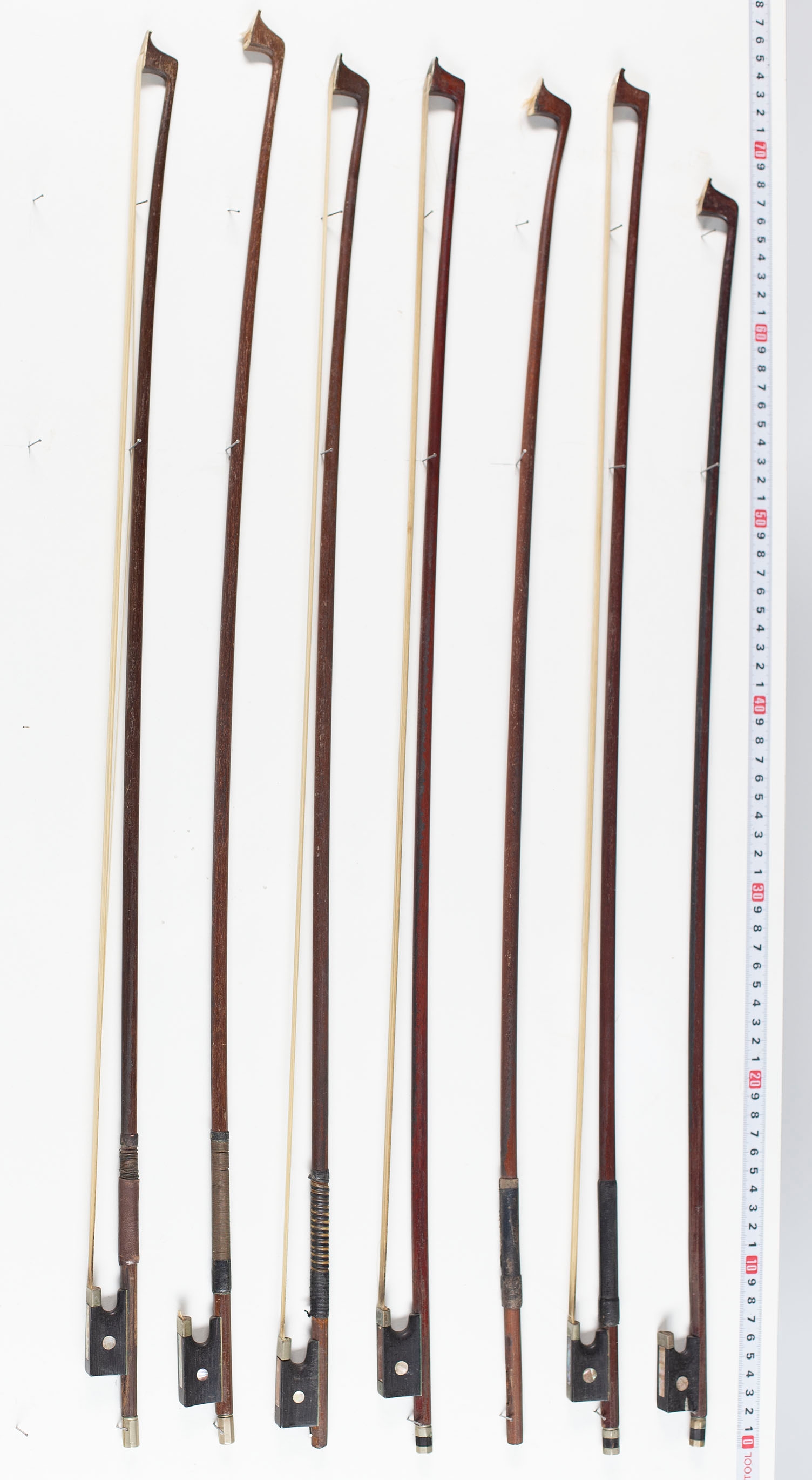 Twenty-two violin bows and five bow sticks, varying lengths