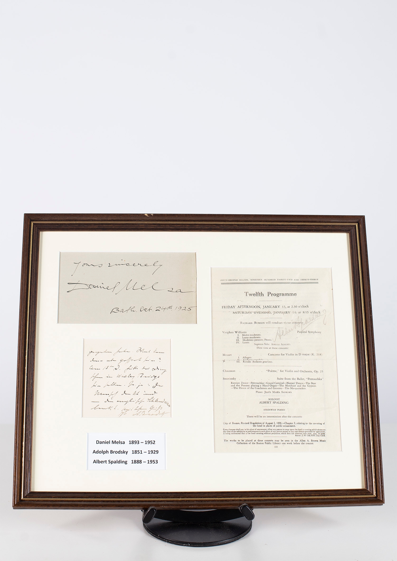 A framed set of autographs - Daniel Melsa, Adolph Brodsky, Albert Spalding