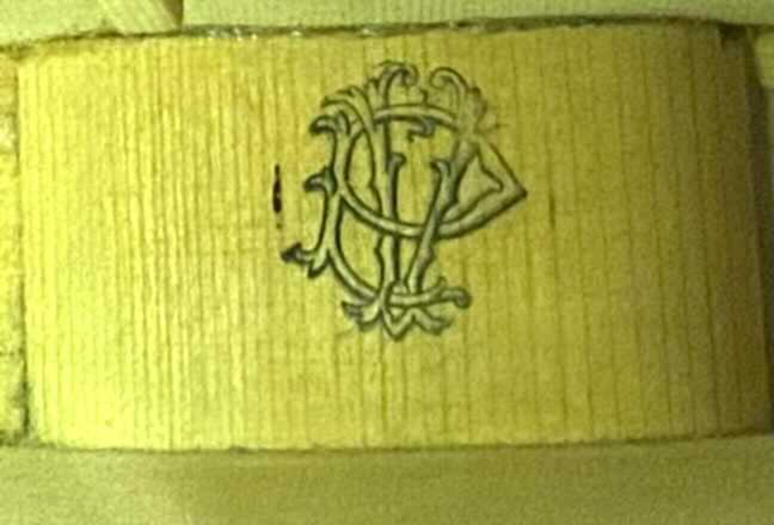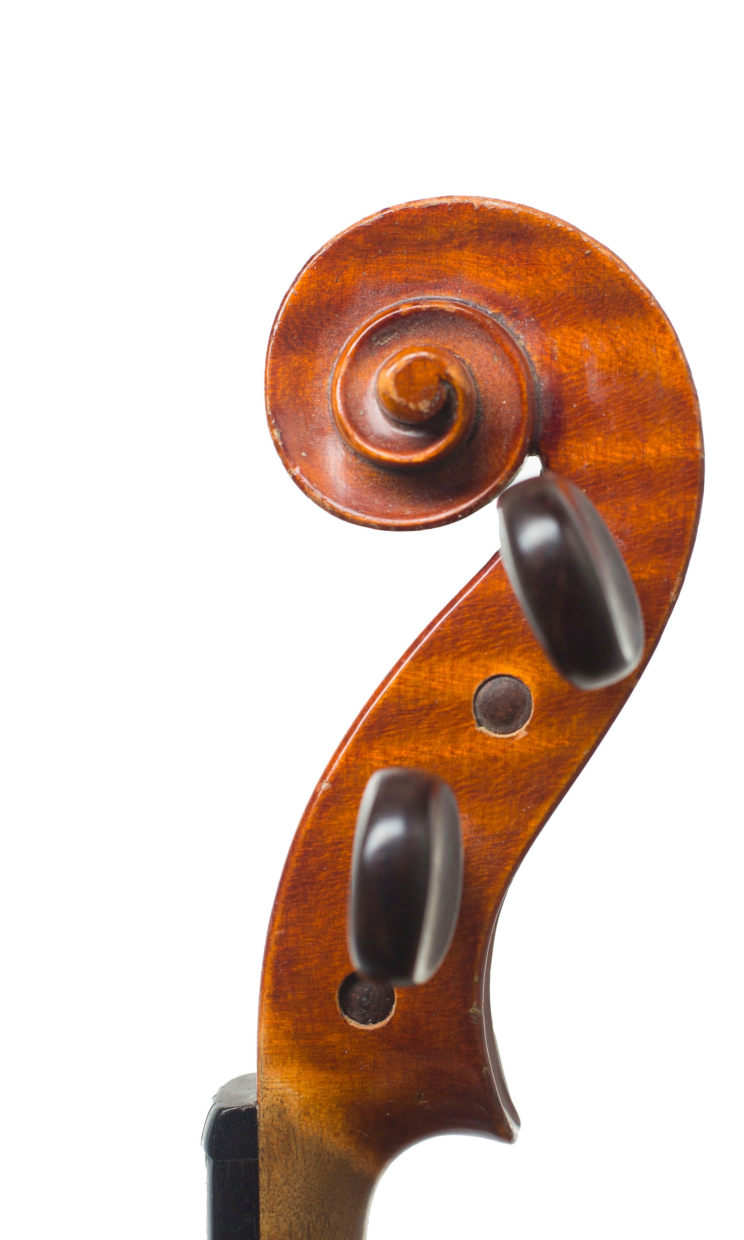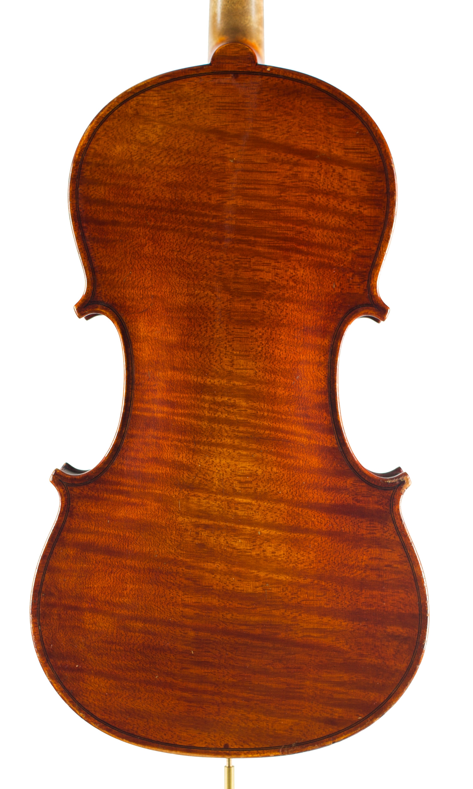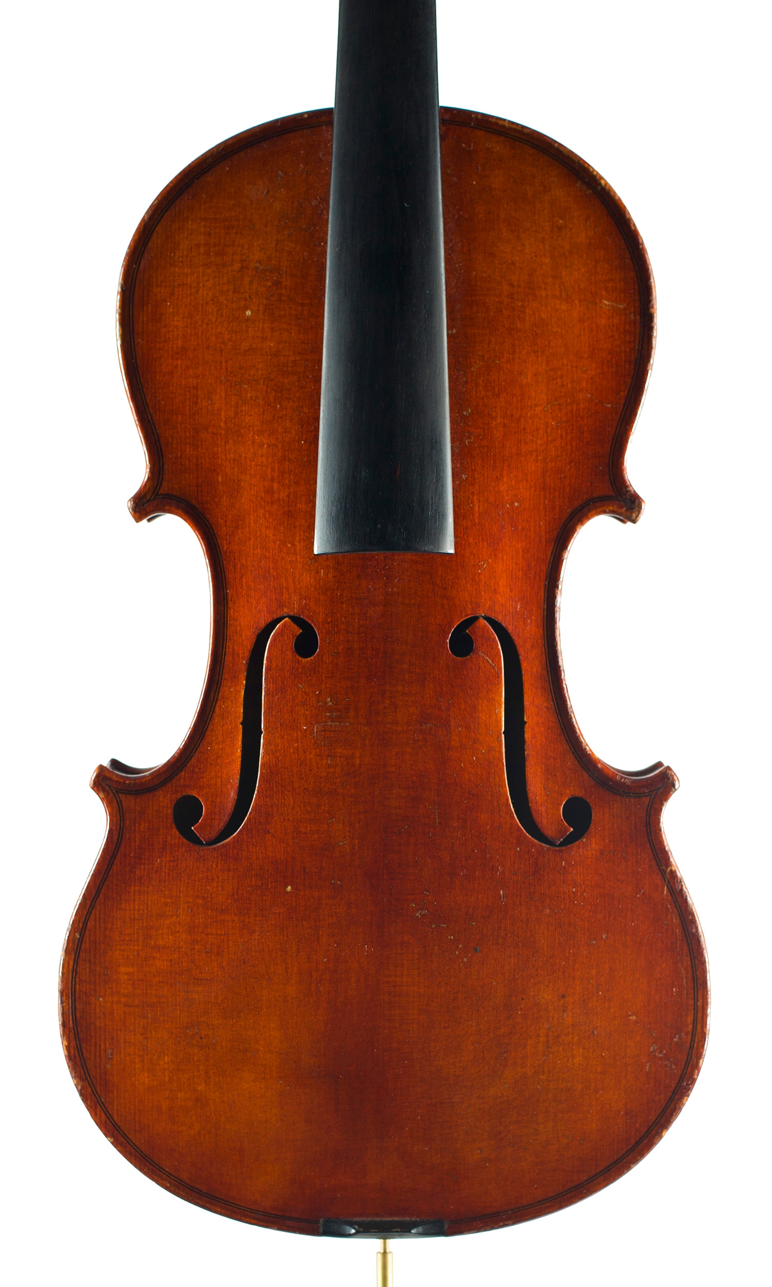A violin, branded VP on top-block