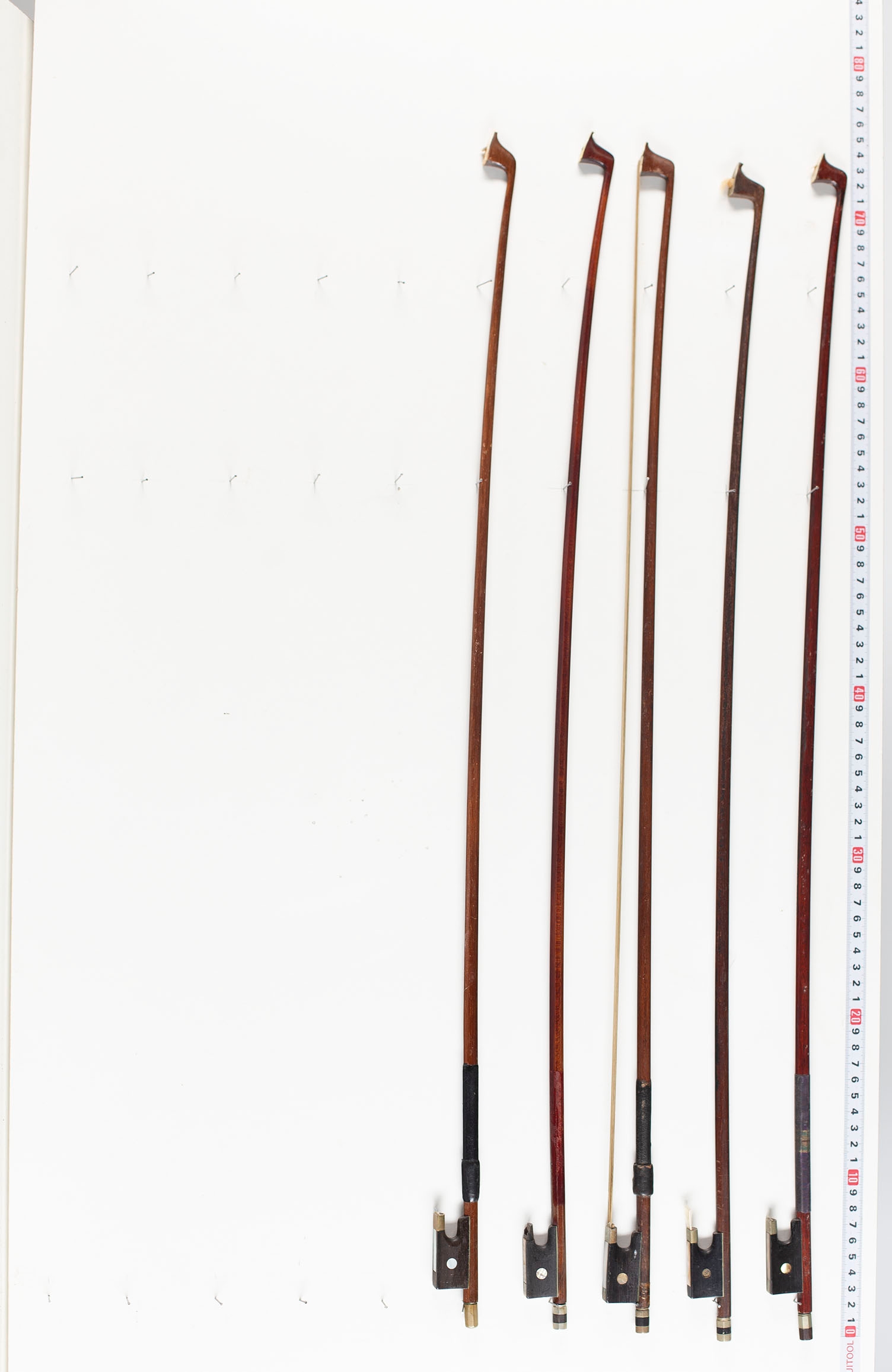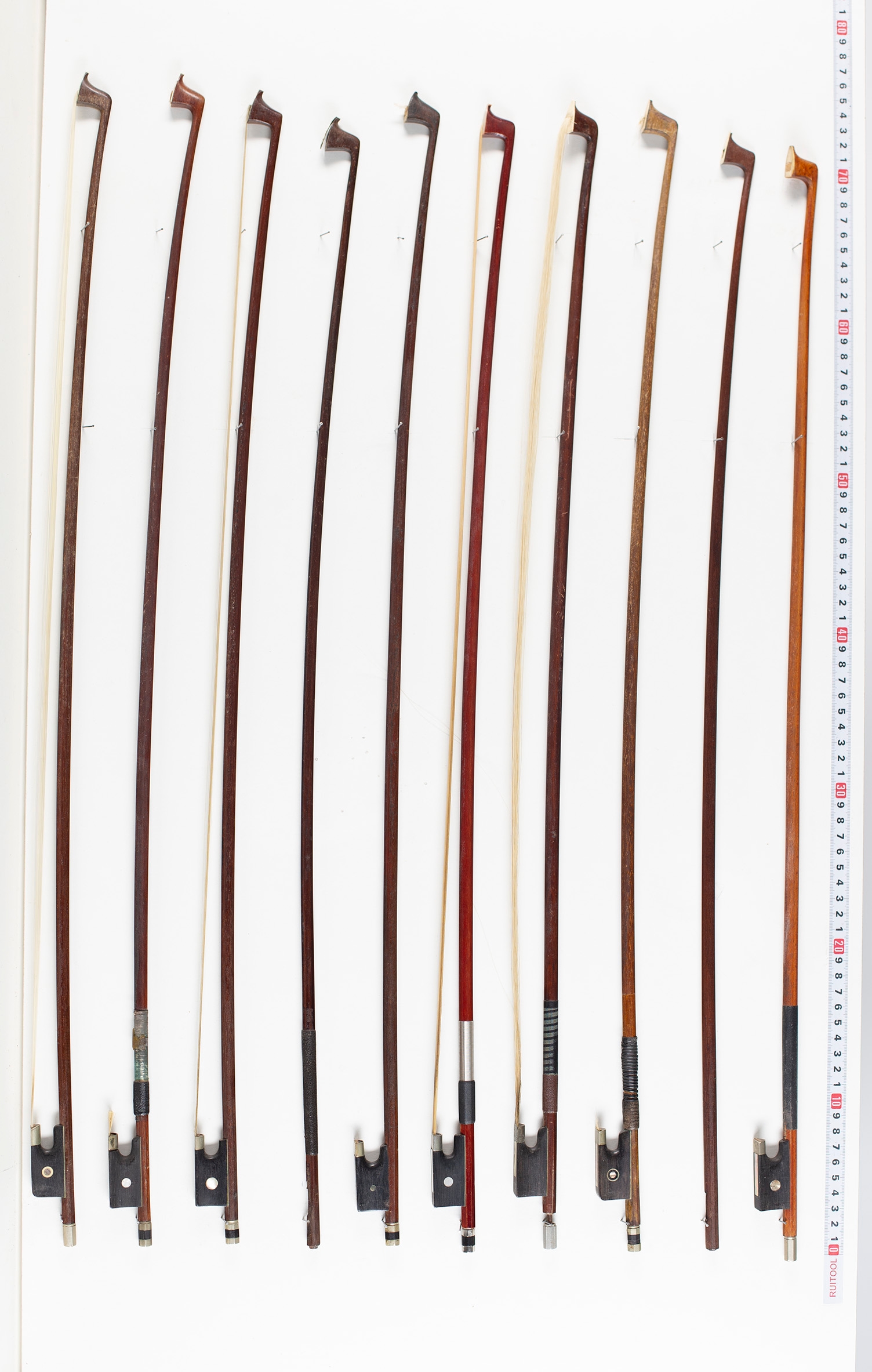 Thirteen violin bows and two violin sticks, varying lengths
