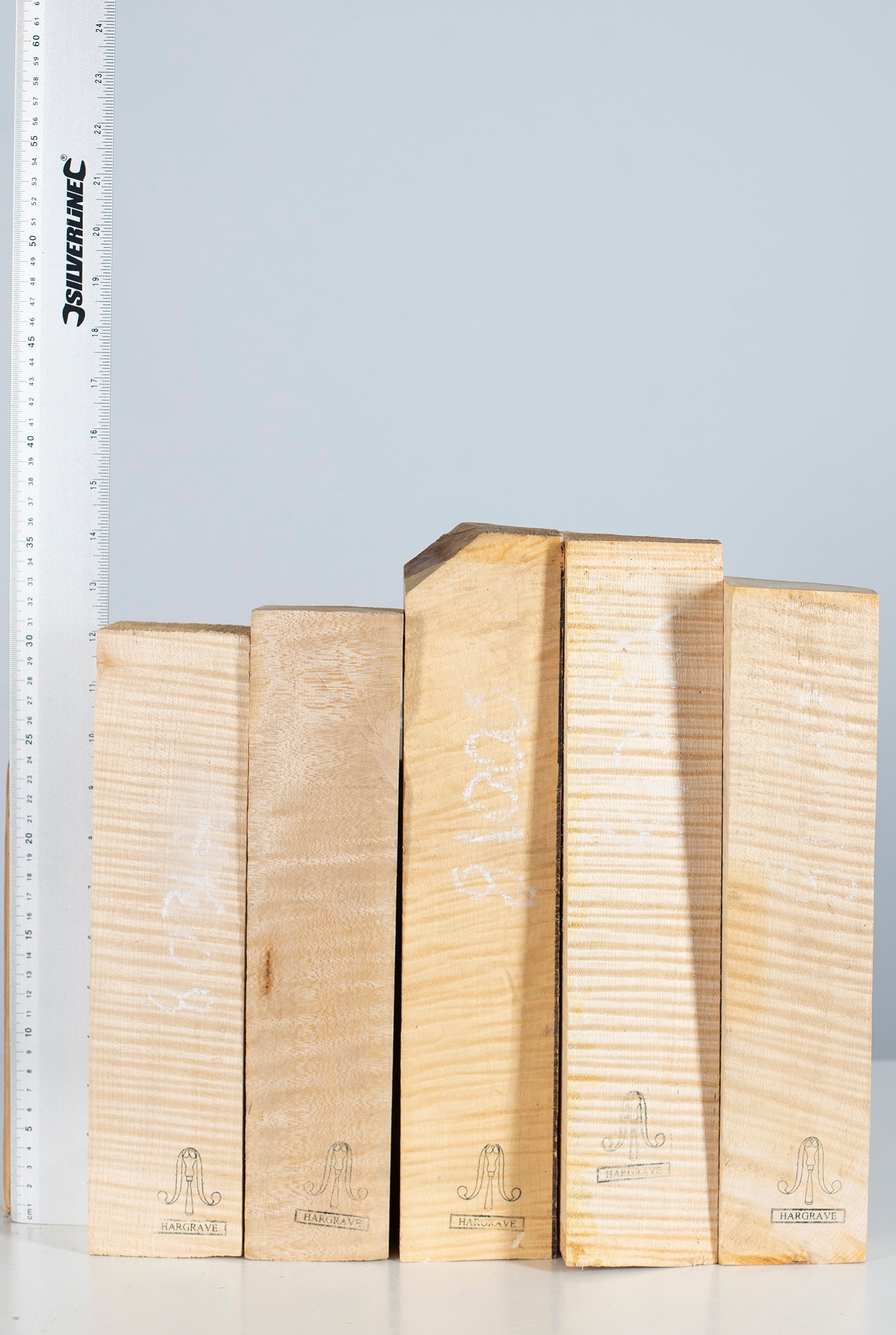 Five violin scroll blocks, maple