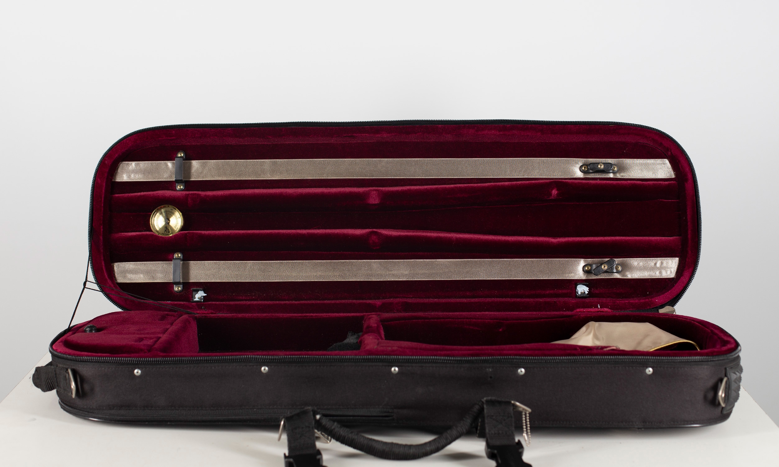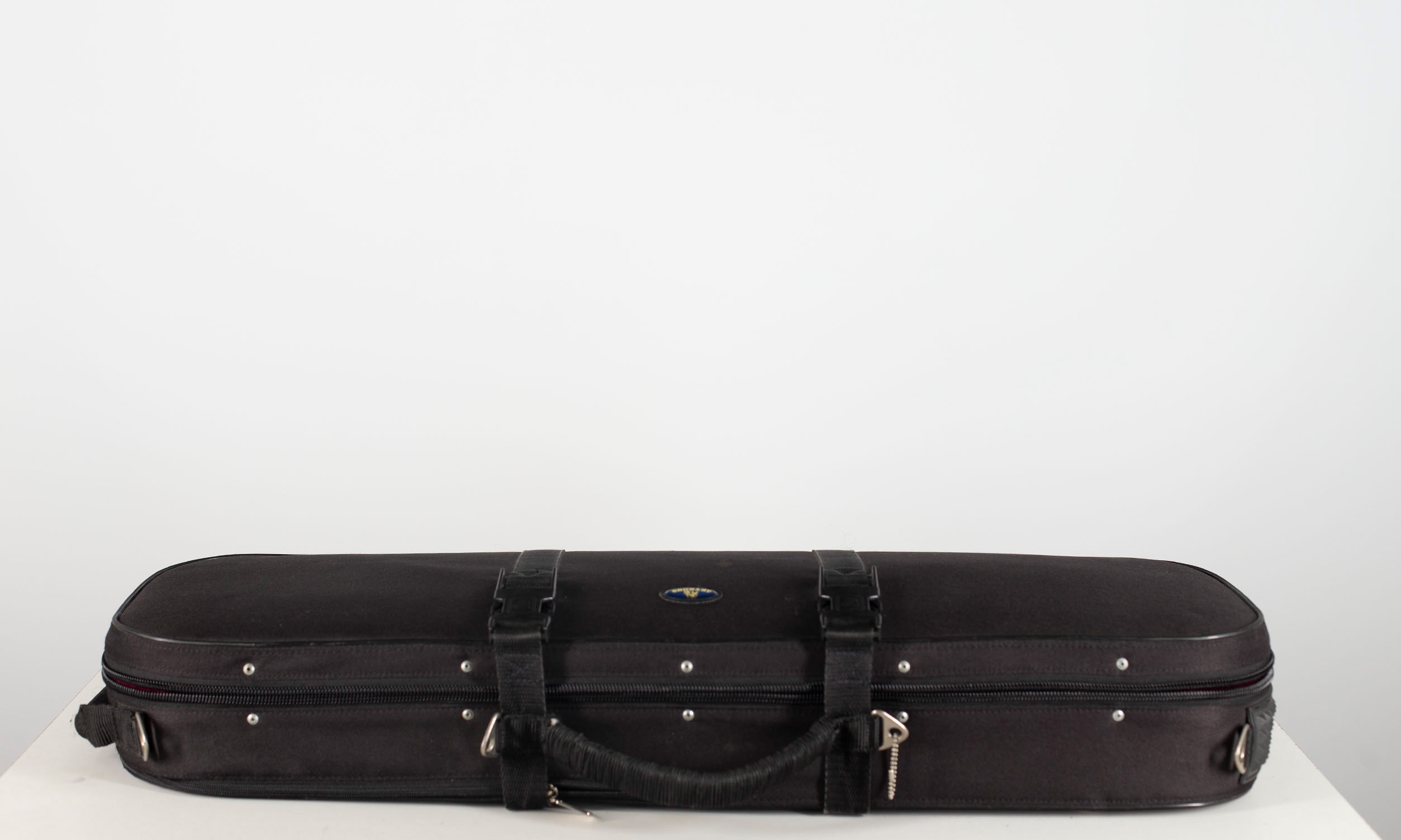 A violin case, branded Artomus