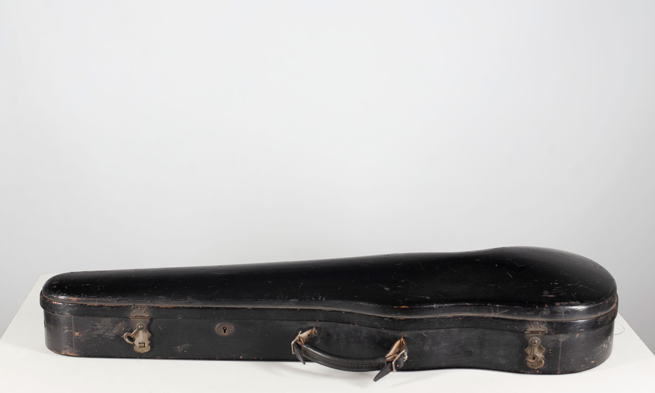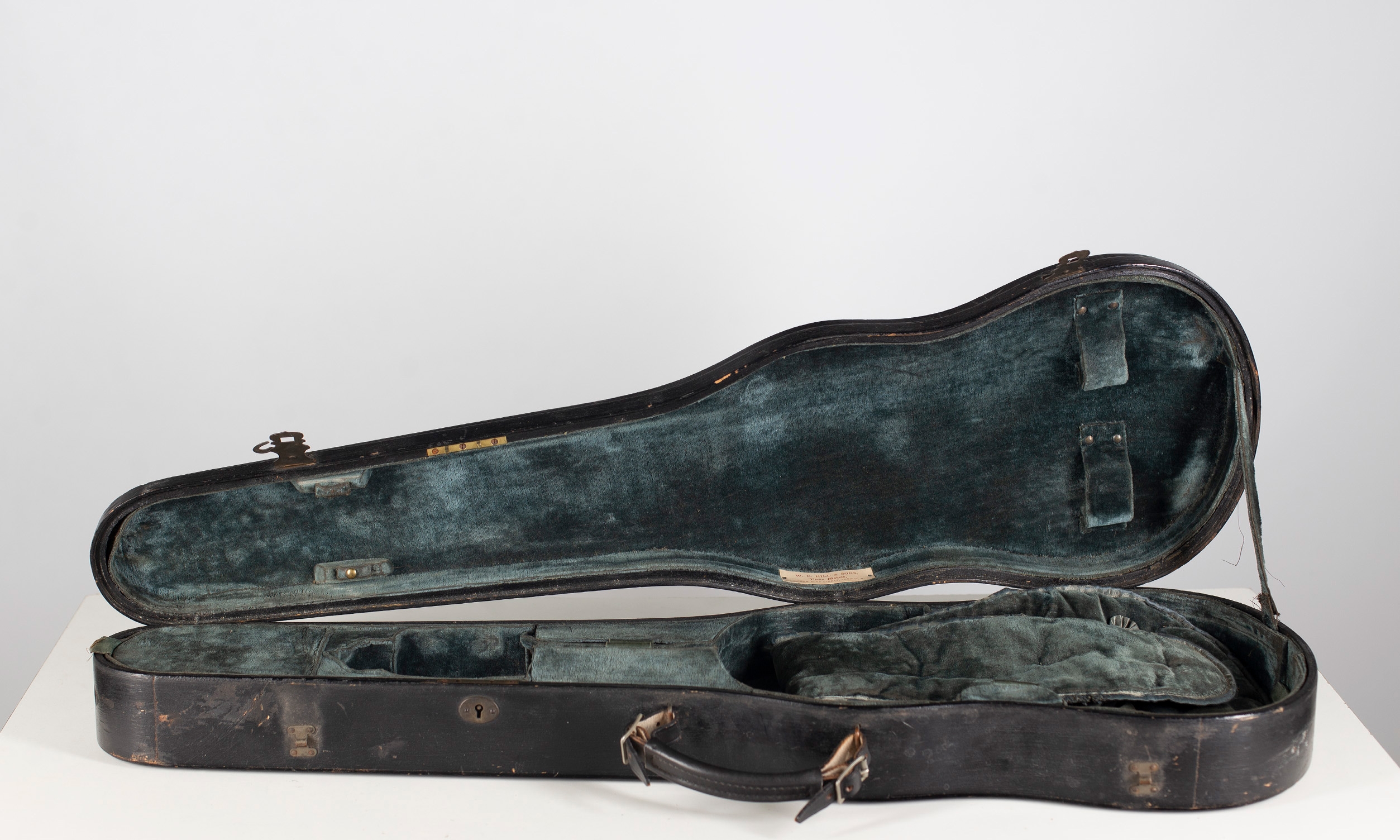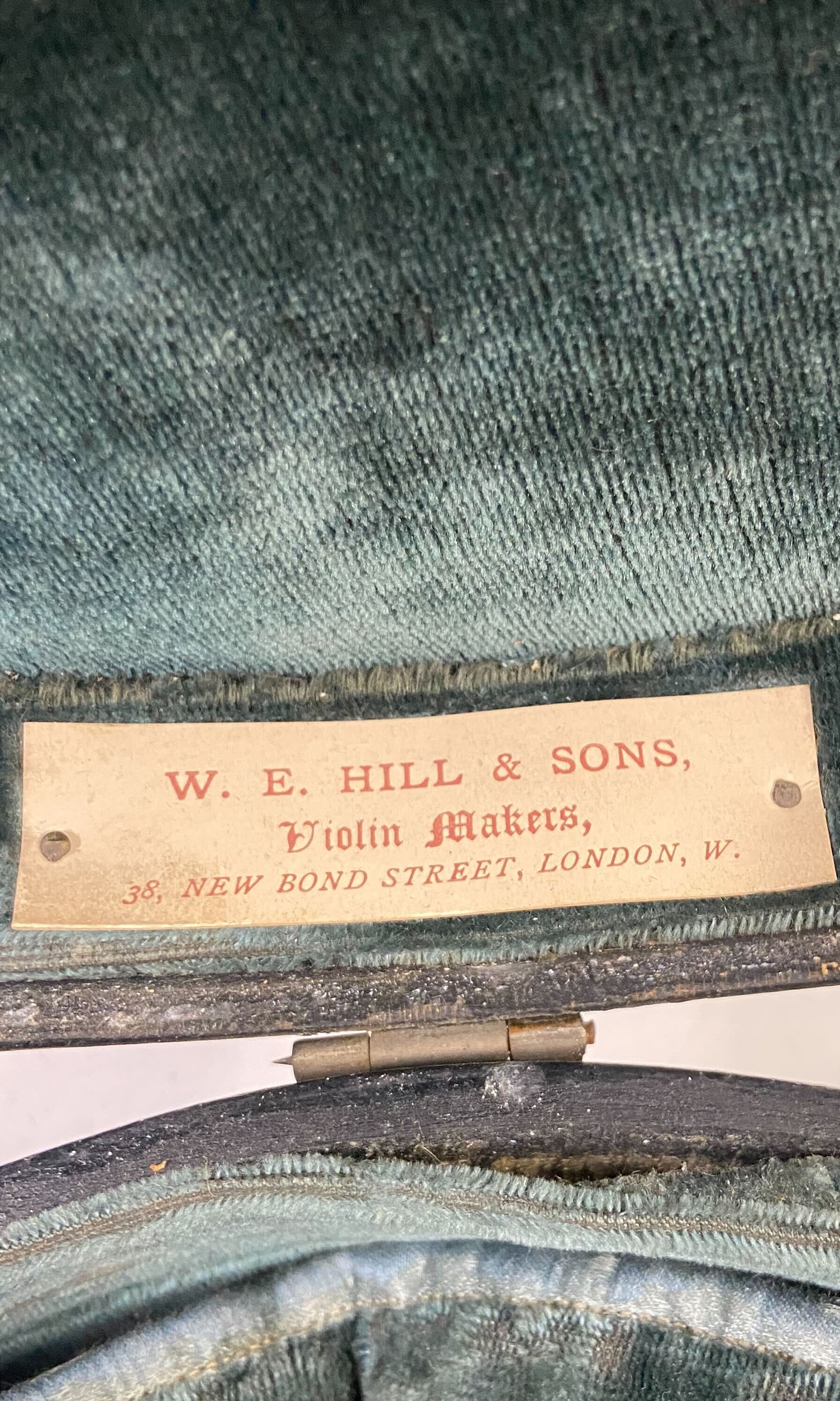 A violin case, branded W. E. Hill & Sons