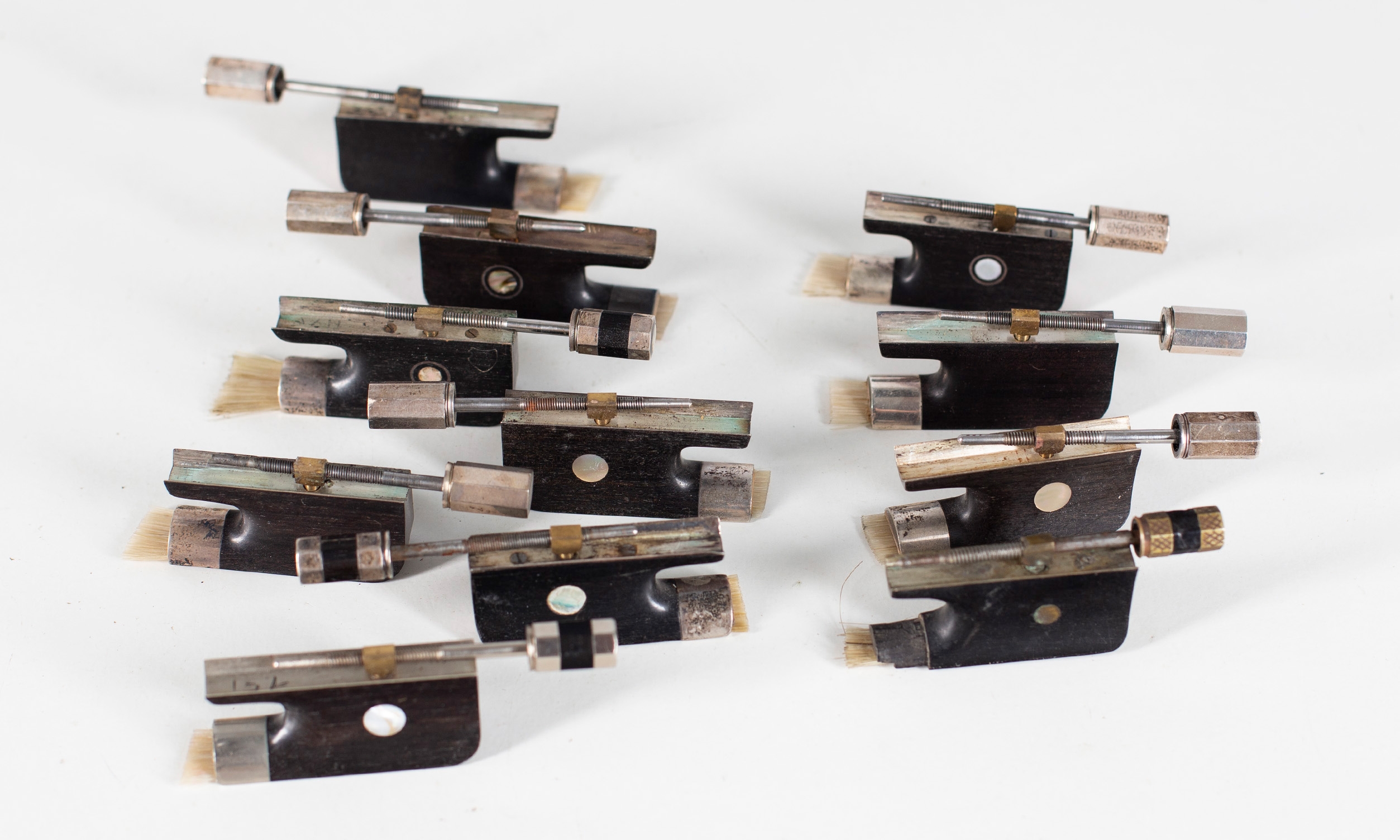 Ten silver-mounted cello frogs and one nickel-mounted cello frog