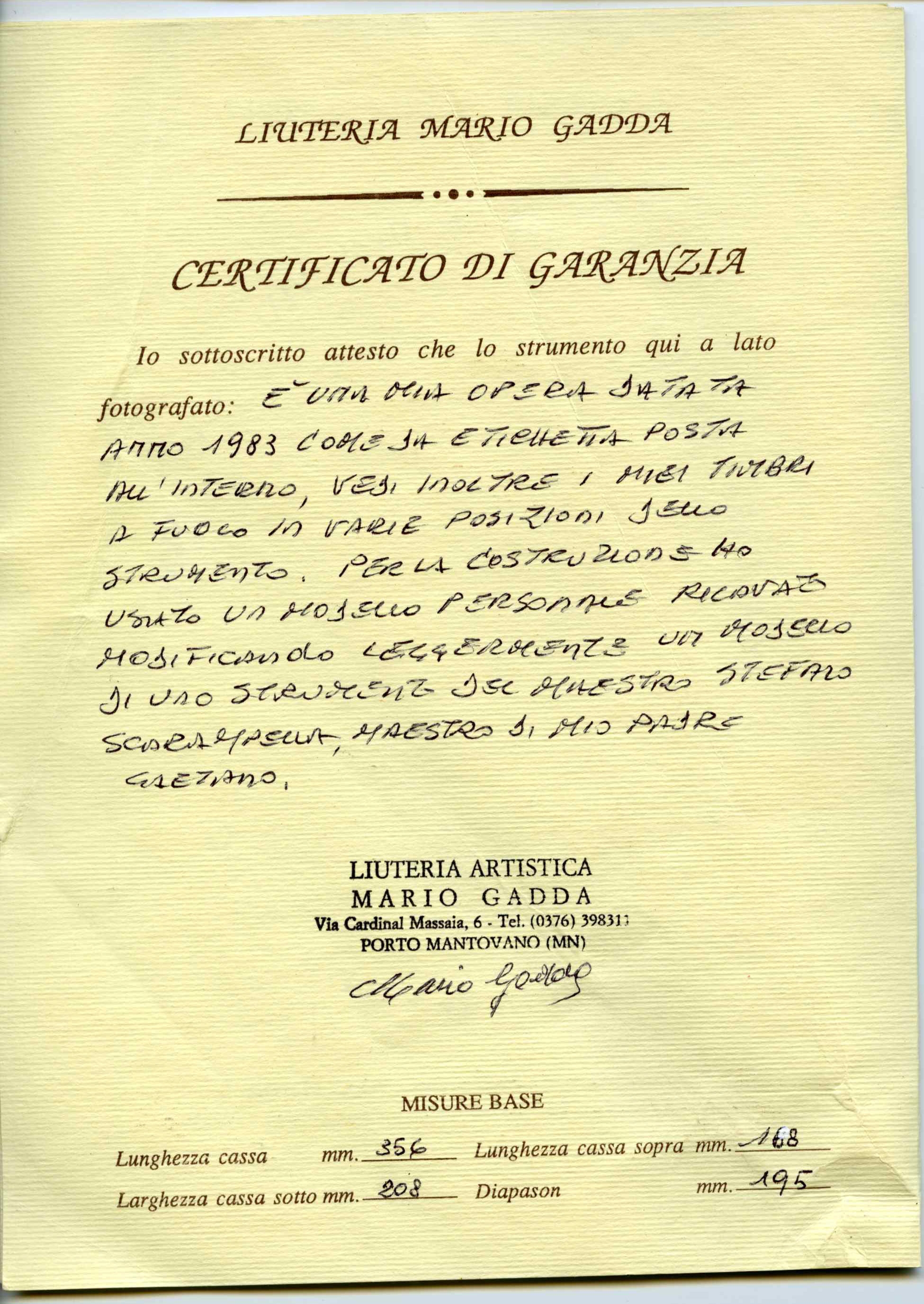 Sold with a certificate of Mario Gadda, Italy, 1983