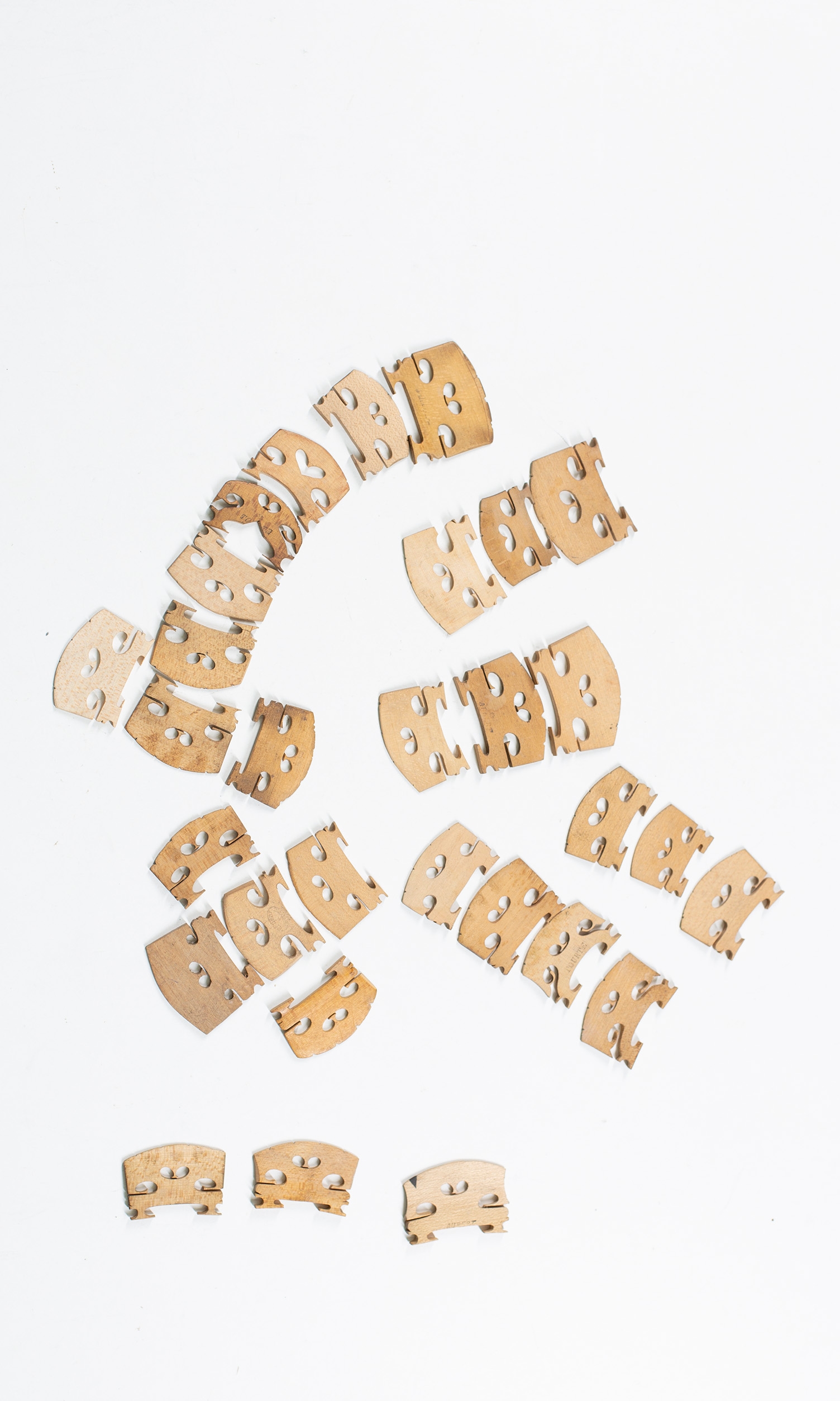 Thirty old violin bridges, some branded