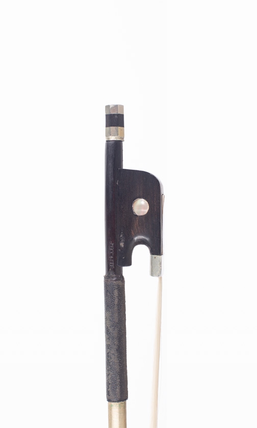 A nickel-mounted cello bow, branded Peccatte