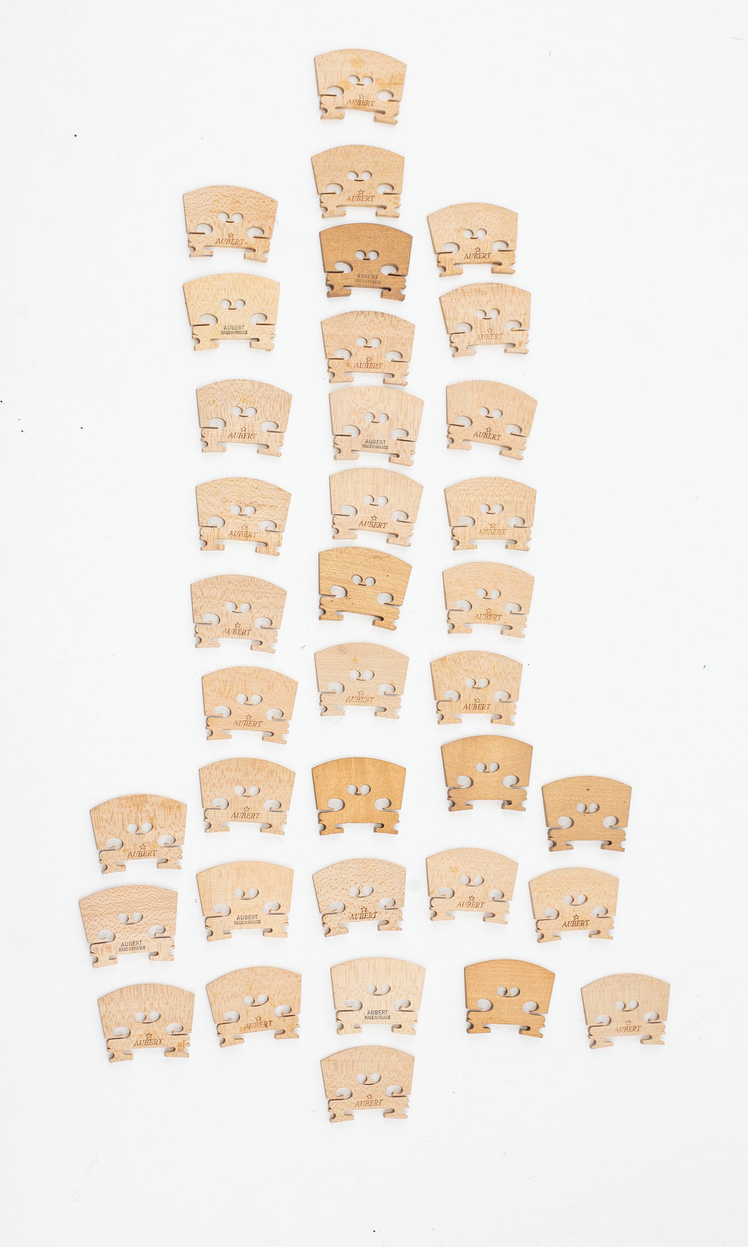 A collection of violin and viola bridges, varying sizes