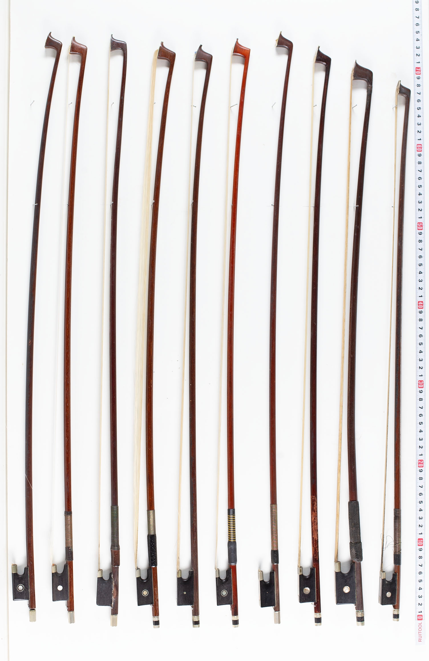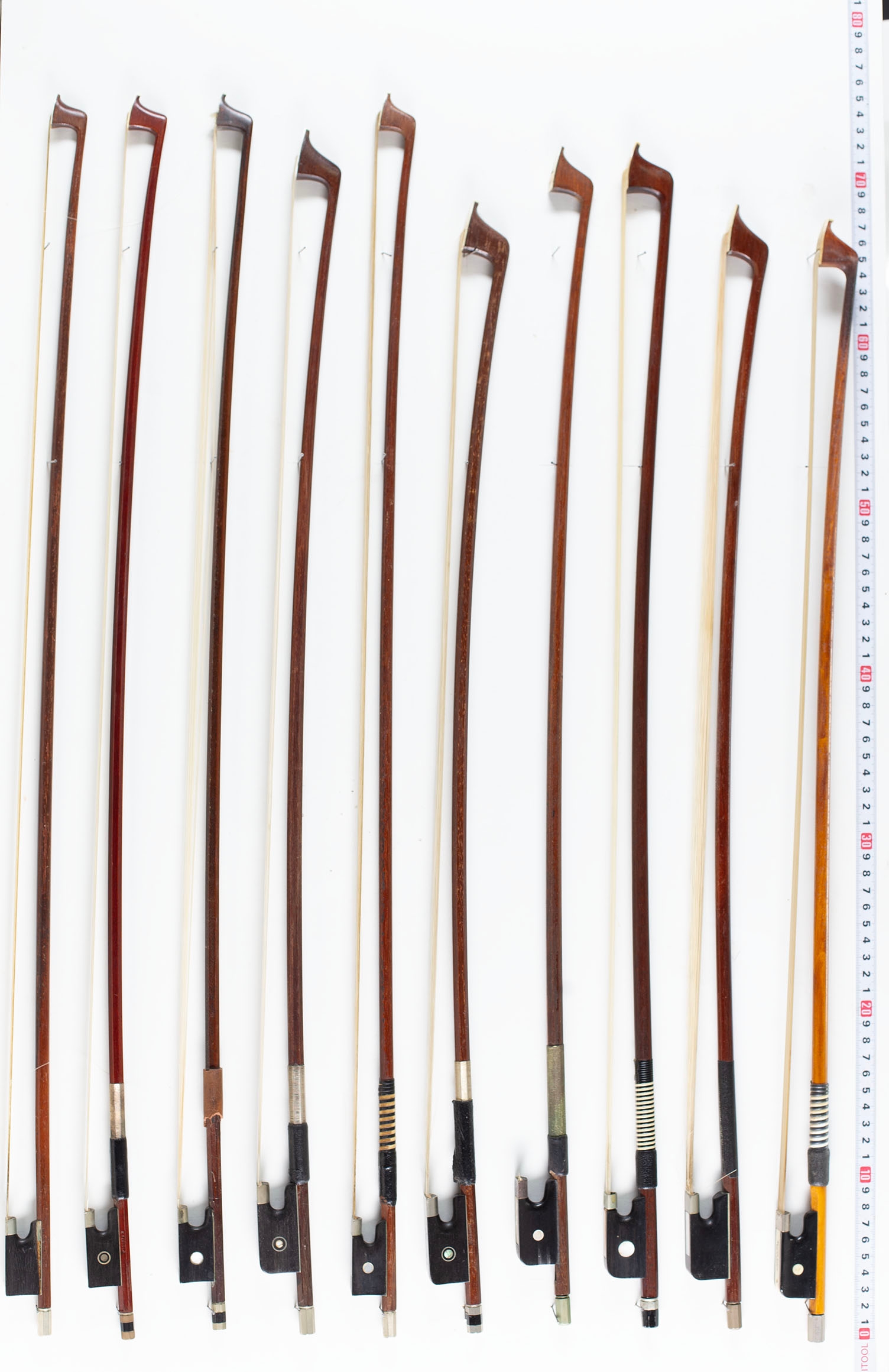 Twelve violin bows and eight cello bows, varying lengths