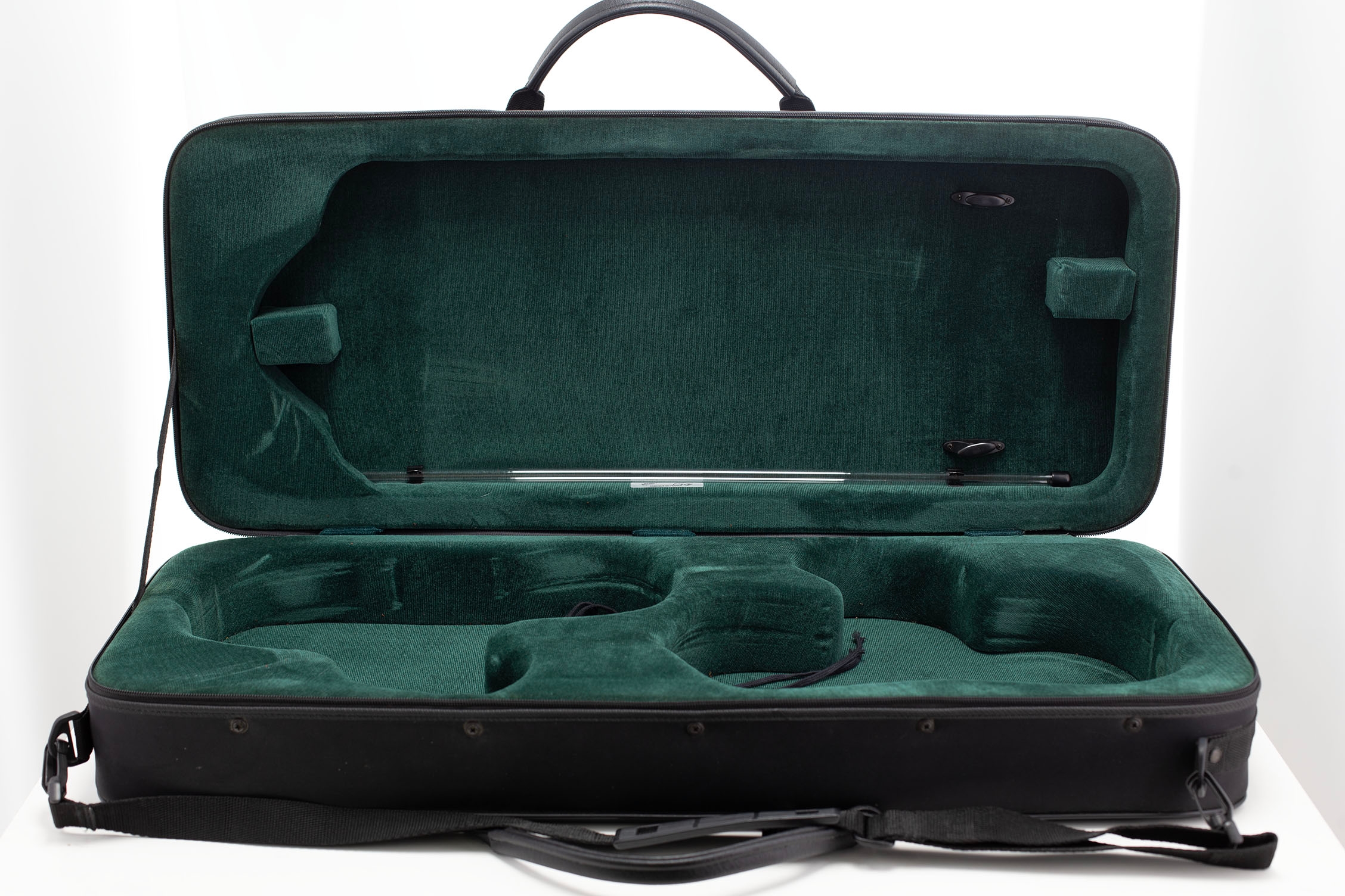 A double violin case, branded Orly