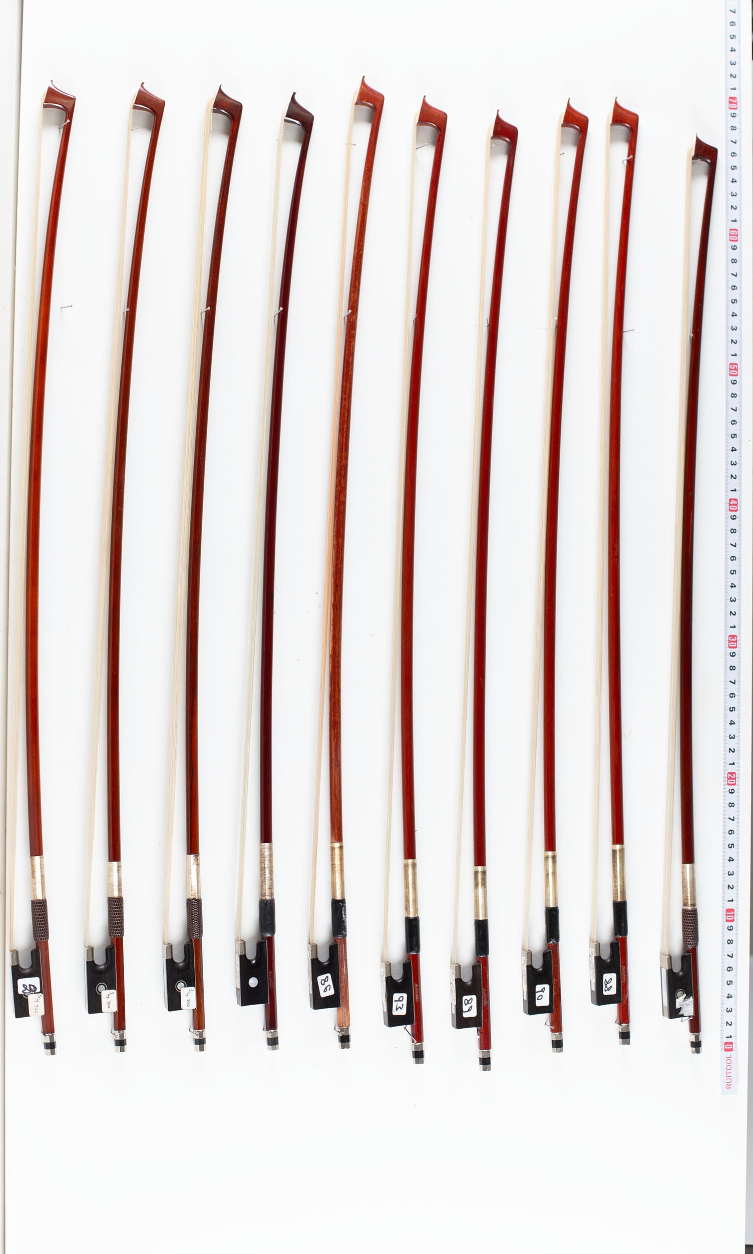 A bundle of twelve violin bows, varying sizes