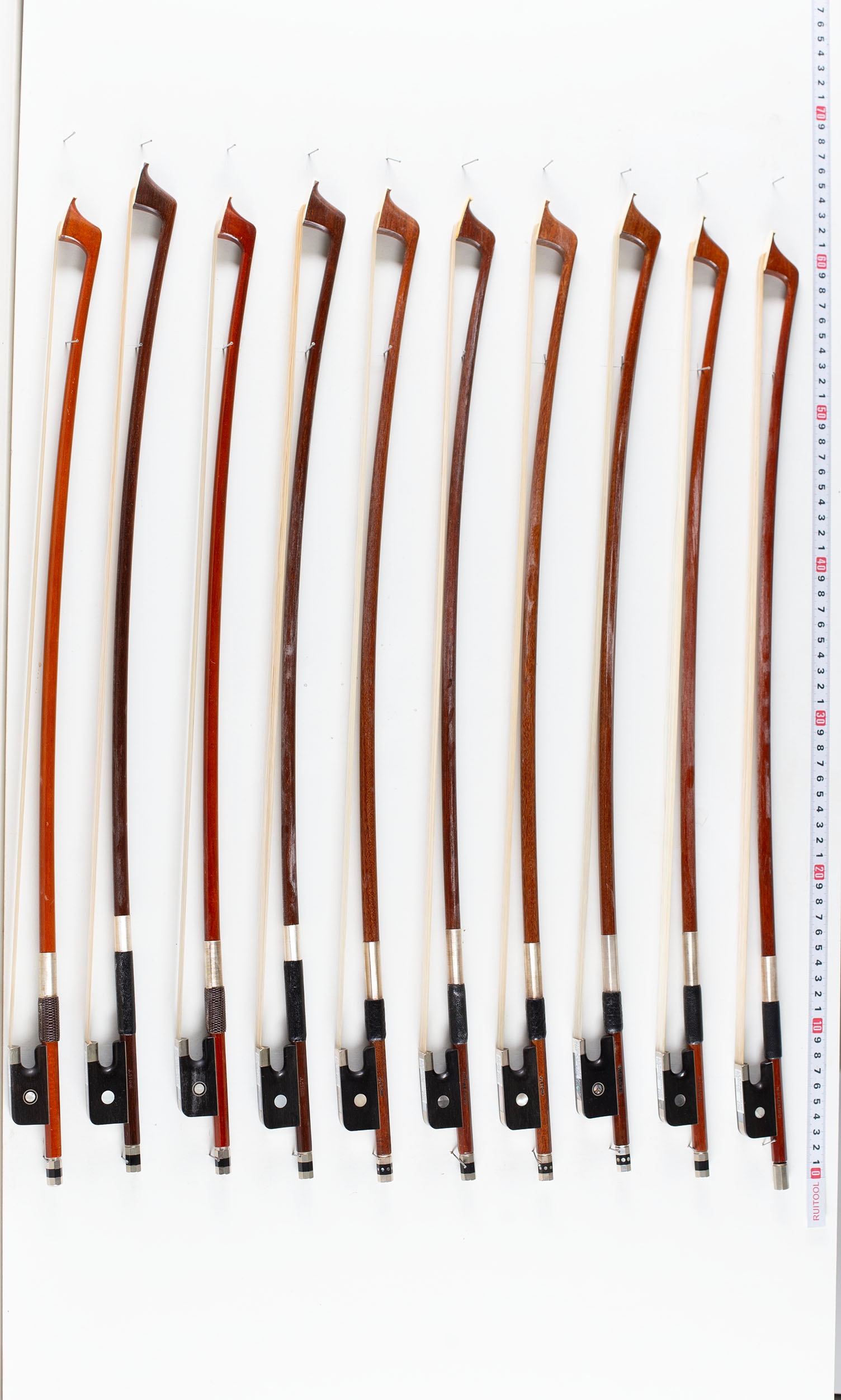 A bundle of ten 1/2 sized cello bows, varying sizes