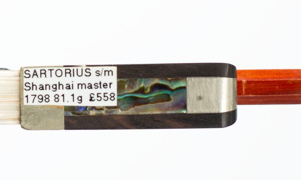 A silver-mounted cello bow, branded Sartorius Satory model