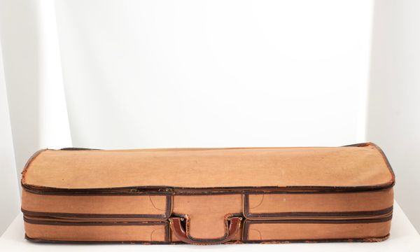 A double violin case, branded W. E. Hill & Sons