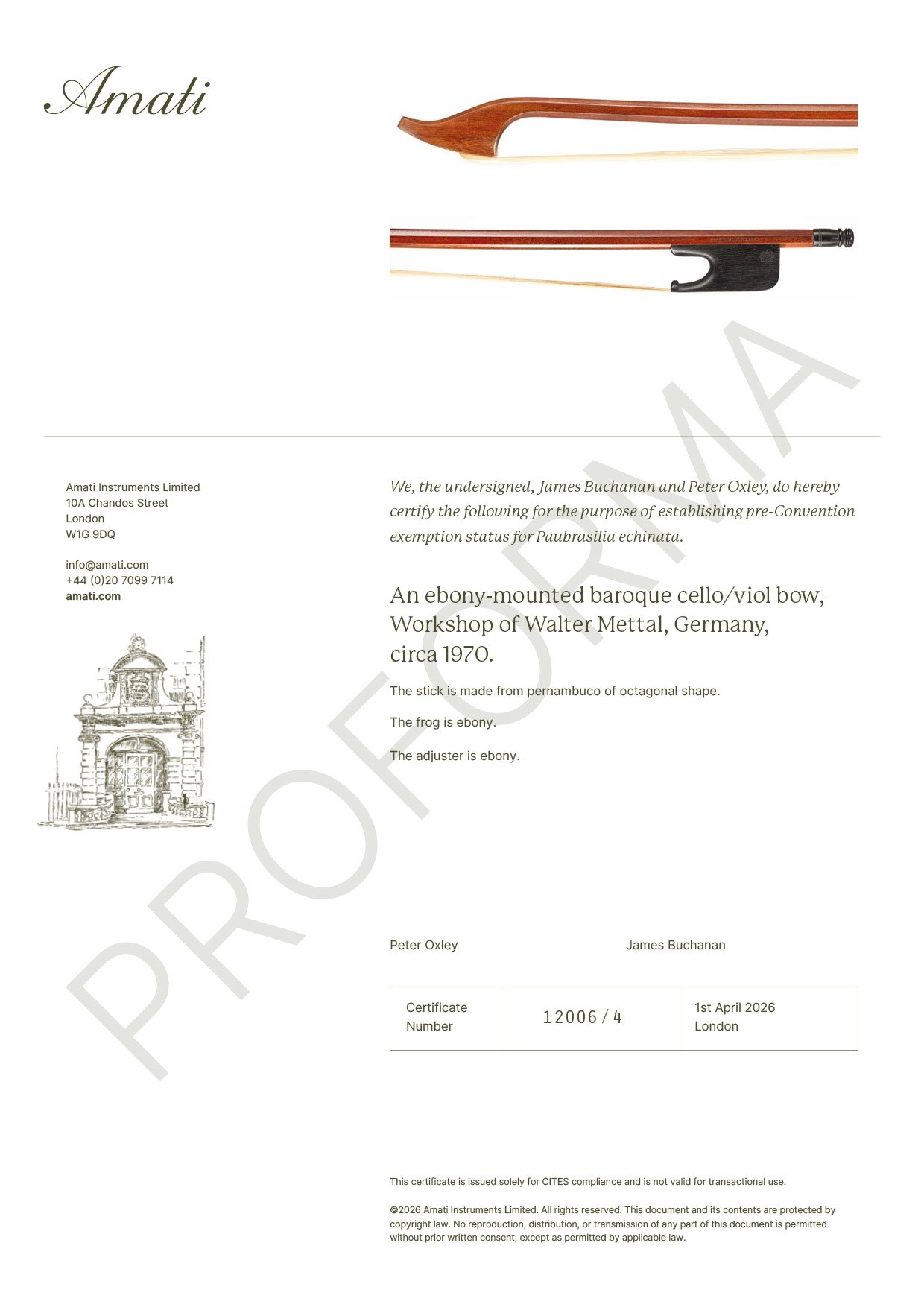 This document provides supporting evidence for CITES applications but does not constitute a CITES permit. The buyer will have the opportunity to purchase this original certificate for £100 + VAT.