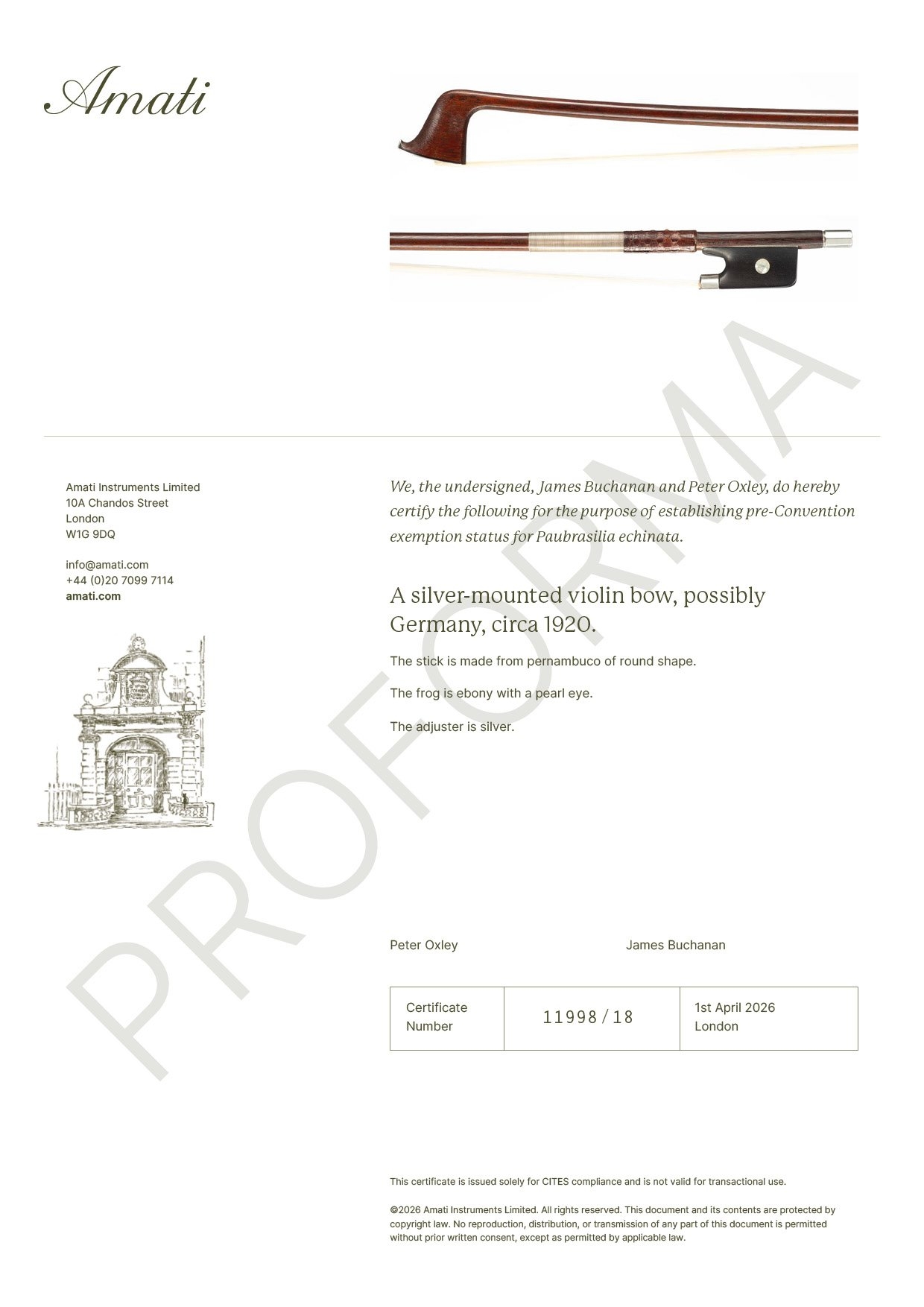 This document provides supporting evidence for CITES applications but does not constitute a CITES permit. The buyer will have the opportunity to purchase this original certificate for £100 + VAT.